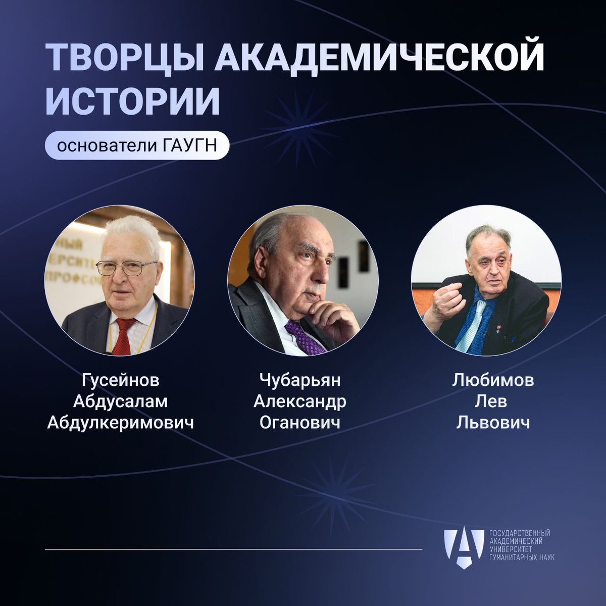 Отцы-основатели ГАУГН: часть III 📌 Мы завершаем рубрику, приуроченную к дню преподавателя высшей школы и посвящённую тем, кто стоял у истоков нашего Университета и сыграл важную роль в его становлении. ➡️ Александр Оганович Чубарьян (род. 1931) – доктор исторических наук, академик РАН, профессор, ректор ГАУГН с 1996 по 2007 годы, действующий президент ГАУГН, декан Исторического факультета ГАУГН, полный кавалер ордена "За заслуги перед Отечеством", автор более 350 научных работ и учебных пособий и не только – перечислять заслуги Александра Огановича можно долго. Не будет преувеличением сказать, что без него ГАУГН не стал бы таким, какой он есть сегодня, не было бы многих его уникальных особенностей. Александр Оганович – не просто один из отцов-основателей Университета, а эпоха в его истории. ➡️ Лев Львович Любимов (1936-2021) – доктор экономических наук, профессор, первый ректор ГАУГН. Рождение и первые шаги ГАУГН он вспоминал так: «Я сказал: «Давайте мы возьмем социологию, политоло