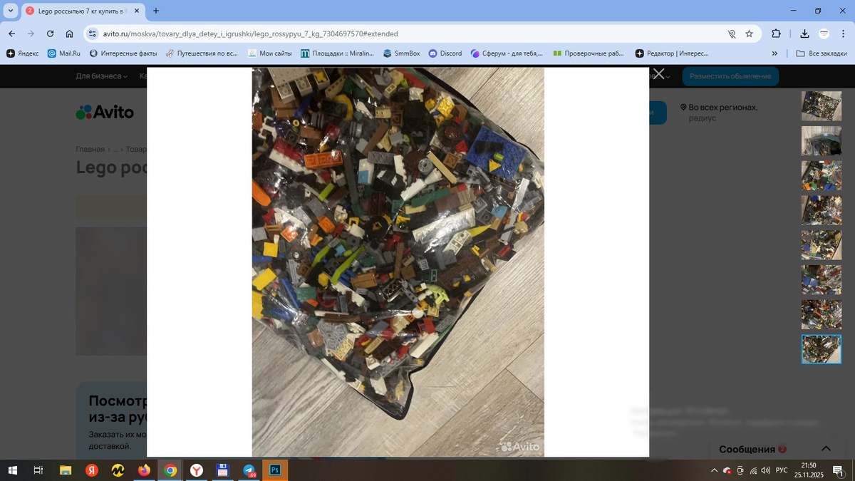 Если честно, давно хотел что-то такое выцепить, но чтобы — не переплата, не конструктор-самопал, а настоящая оригинальная россыпь, в которой есть и сюрприз, и немного риска. И вот, свершилось! 📦 Сделка недели: 7 кг LEGO за 3700 рублей Недавно нашёл на Авито объявление — мешок Лего весом 7 кг. Цена — 3700 с доставкой. Продавец сразу понравилась: общительная, на связи, сразу сказала, что всё — оригинал, но фигурки и инструкции оставит себе — хочет продавать отдельно. Мы даже обменялись контактами: она обещала написать, когда выставит минифигурки — если цена будет норм, может, и у неё заберу. На фото всё выглядело как надо, и вживую — тоже. Качество пластика, отливка, даже запах — всё говорит о том, что это не китайский самопал, а самое настоящее LEGO. И, признаюсь, копаться в нём — отдельное удовольствие. Всё перемешано, дет