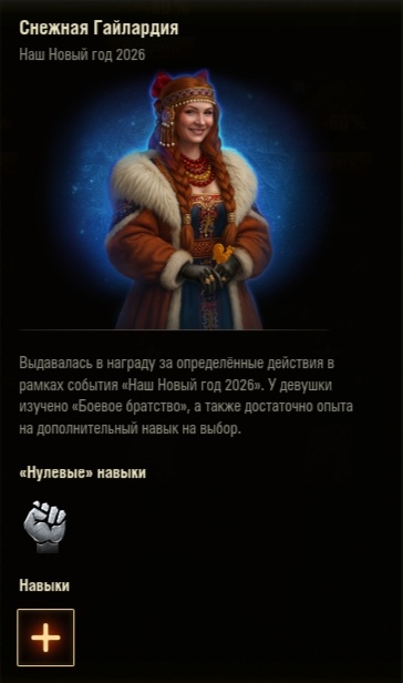 Встречайте праздничное пополнение команды в событии "Наш Новый год 2026"! В этом году ваш экипаж пополнится очаровательными и отважными женщинами: * Снежная Гайлардия – воплощение зимней свежести и решимости. * Морозная Бруннера – хладнокровная и эффективная, словно сама зима. * Полярная Лантана – яркая и неутомимая, осветит даже самый темный путь. * Зимняя Маттиола – изысканная и стойкая, вдохновляет своим присутствием. Не упустите шанс заполучить этих уникальных членов экипажа и вместе отпраздновать "Наш Новый год 2026"!