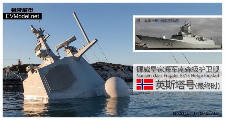 Китайская EV Model выпустила на 3D-принтере модель норвежского фрегата F313 класса "Нансен" в масштабе 1/700 с довольно издевательской картинкой на коробке: Nansen class Frigate F313 Helge Ingstad (каталожный номер S118)