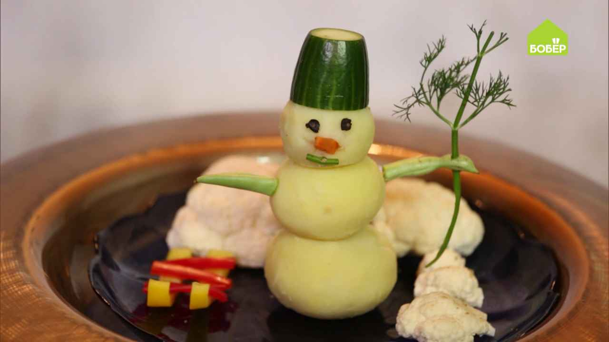 Оригинальная и очень вкусная идея для вашего праздничного стола! Возьмите три круглые картофелины разного размера, отварите и очистите. Для устойчивости сделайте плоский срез на одной из картошек и установите на тёмную тарелку. Таким же образом подготовьте второй ярус и сделайте голову. Из свежего огурца сделайте шляпу и прикрепите зубочисткой к голове снеговика. Из маслин при помощи колпачка от фломастера выдавите заготовки для глаз. Отломите у зубочистки тонкий кончик и прикрепите глаза из маслин к голове. Вырежьте небольшое отверстие и вставьте кусочек морковки. Из стебелька укропа сделайте рот, вставив посередине заготовки зубочистку. Установите рот на место. Руки у снеговика будут из стручковой фасоли. Прежде чем их отрезать, примерьте зубочистку. Прикрепите руки к туловищу. В одну из рук установите метёлку из укропа. Из болгарского перца жёлтого цвета сделайте полозья для санок. Перекладины санок сделайте из болгарского перца красного цвета. Сугробы сделайте из цветной капусты,