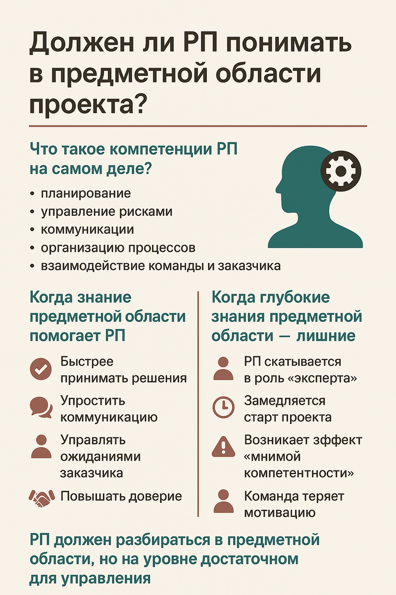 ✔ РП должен разбираться в предметной области — но на уровне достаточном для управления.