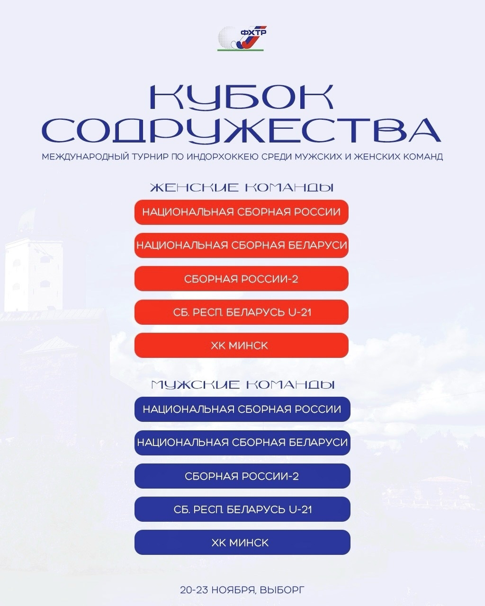 Международный турнир по индорхоккею среди мужских и женских команд пройдет с 20 по 23 ноября в Выборге. В соревнованиях примут участие 5 женских и 5 мужских команд, в том числе: Источник: Официальная группа Федерации хоккея на траве России в ВК.