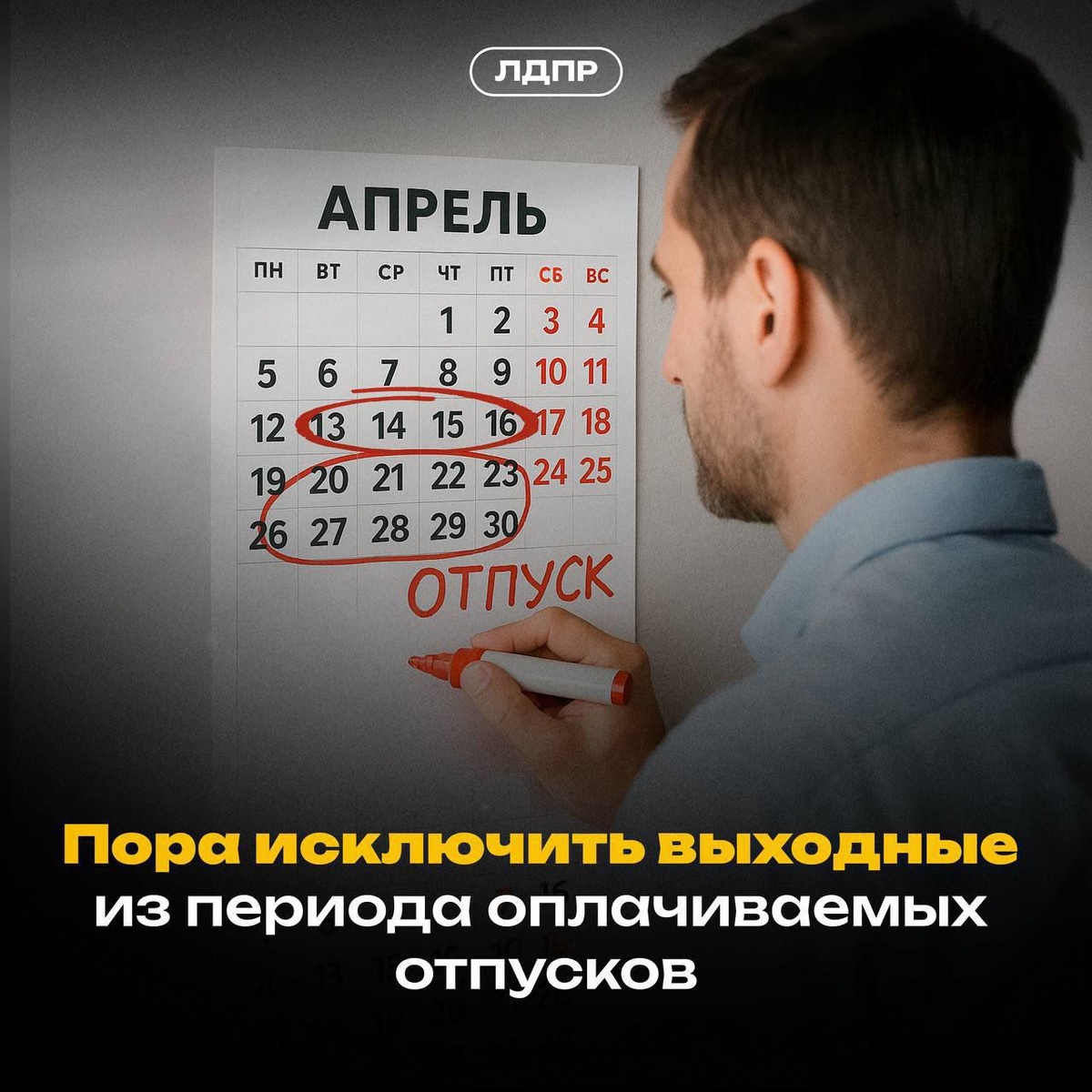 ✅ ЛДПР предлагает исключить выходные из числа отпускных дней. ❓Вопрос о том, как правильно считать отпускные дни, вновь стал актуальным. Государство гарантирует работникам 28 дней для полноценного отдыха. Но выходные, которые включаются в этот период, фактически сокращают время, отведенное на восстановление сил и решение бытовых вопросов. 🔵 Депутаты фракции ЛДПР во главе с Леонидом Слуцким выдвинули инициативу, согласно которой в период оплачиваемых отпусков будут учитываться только рабочие дни. Это нововведение сделает систему подсчёта отпускных дней более логичной и выгодной для работников. 💬 Например, если вы берете две недели отпуска, то с учетом выходных ваш отдых может составить не 14, а целых 18 дней! Такое изменение позволит людям лучше планировать своё время и повысит качество отдыха, что, в свою очередь, скажется на производительности труда.