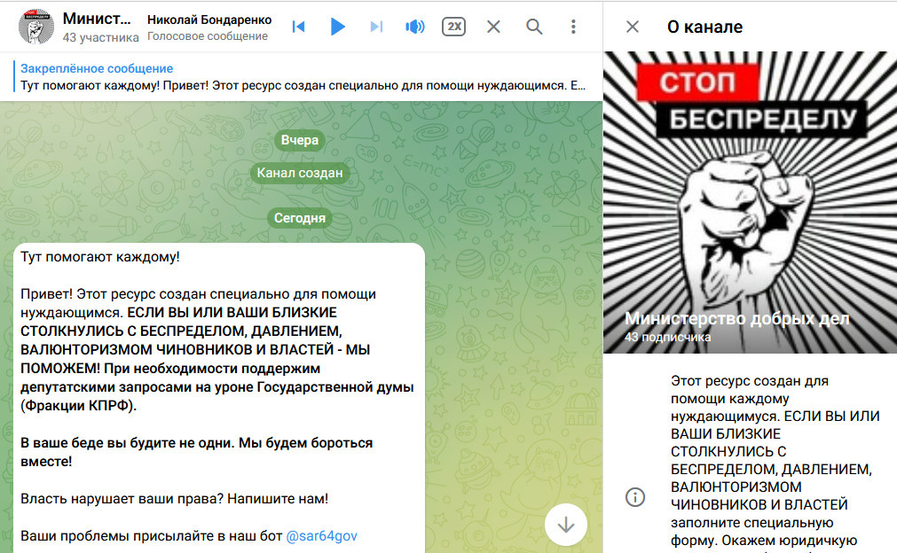 Привет! Этот ресурс https://t.me/narodnayainiciativa создан специально для помощи нуждающимся. ЕСЛИ ВЫ ИЛИ ВАШИ БЛИЗКИЕ СТОЛКНУЛИСЬ С БЕСПРЕДЕЛОМ, ДАВЛЕНИЕМ, ВАЛЮНТОРИЗМОМ ЧИНОВНИКОВ И ВЛАСТЕЙ - МЫ ПОМОЖЕМ! При необходимости поддержим депутатскими запросами на уроне Государственной думы (Фракции КПРФ).