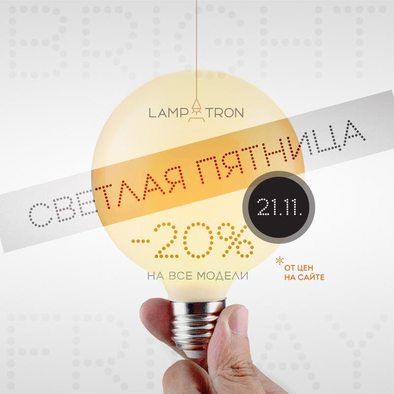 В мире света пятница может быть только светлой! Поэтому LAMPATRON отменяет «Черную пятницу»! А ЧЕРНАЯ СВЕТЛАЯ ПЯТНИЦА открыта уже сегодня! Всем, кто сделает заказ до этой пятницы - 21 Ноября включительно, скидка — 20%OFF от цен, указанных на сайте, на ЛЮБУЮ модель из каталога! Все что нужно - перейти на сайт LAMPATRON.RU 🔻🔻🔻🔻 https://www.lampatron.ru/?utm_source=telegrambf Там вы легко найдете ПРОМОКОД, укажите его в форме заказа на сайте и пользуйтесь скидкой по полной! И не забудьте рассказать о СВЕТЛОЙ ПЯТНИЦЕ своим друзьям и тем, кому может быть интересен подбор модного дизайнерского освещения на особо выгодных условиях! Главный SALE года начался! Зажжём по-полной?!