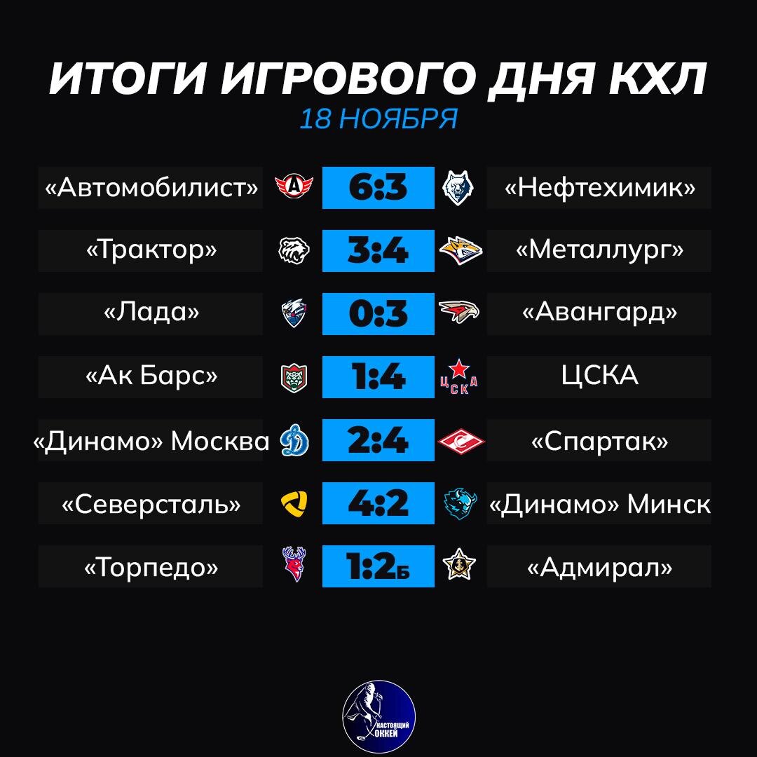 📊 «Металлург» обыграл «Трактор» в первом матче после ухода Гру, «Автомобилист» победил «Нефтехимик», ЦСКА на выезде разобрался с «Ак Барсом». «Авангард» одержал первую «сухую» победу в сезоне, «Спартак» взял реванш у «Динамо» в московском дерби, «Адмирал» победил «Торпедо» по буллитам 👇 Как вам игровой день? 🔥 - супер 👎 - ничего особенного 🗿 - скучно 📱 Подпишись на НАСТОЯЩИЙ ХОККЕЙ