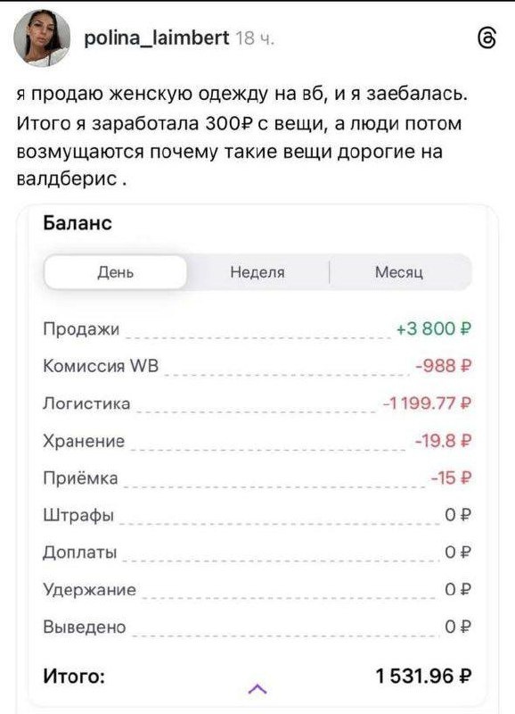 Почему вещи на WB такие дорогие? Вот вам наглядный ответ Каждый раз, когда покупатели пишут «да что вы там зарабатываете, накручиваете цены!», хочется просто показать один такой скрин — и больше ничего не объяснять. Девушка продаёт обычную женскую одежду на WB. Цена вещи — 3800 ₽. Чистая прибыль — 300 ₽. Разбор строки за строкой: • Комиссия WB: –988 ₽ • Логистика: –1199 ₽ • Хранение: –19,8 ₽ • Приёмка: –15 ₽ Итог: 1531 ₽ на руках с 3800 ₽, из которых ещё нужно вычесть себестоимость товара, упаковку, дефекты, возвраты, работу менеджера, закупки, фотоконтент и всю операционку. В реальности у неё остаётся примерно 300 ₽, то есть 7–8% маржи. Вот почему цены на маркетплейсах растут. Вот почему продавцы постоянно на грани. Вот почему многие закрываются или уходят на свои сайты. Маркетплейсы давно перестали быть «лёгким способом продавать». Сегодня это история про выживание. Marketplace_biz - отдай свой буст каналу
