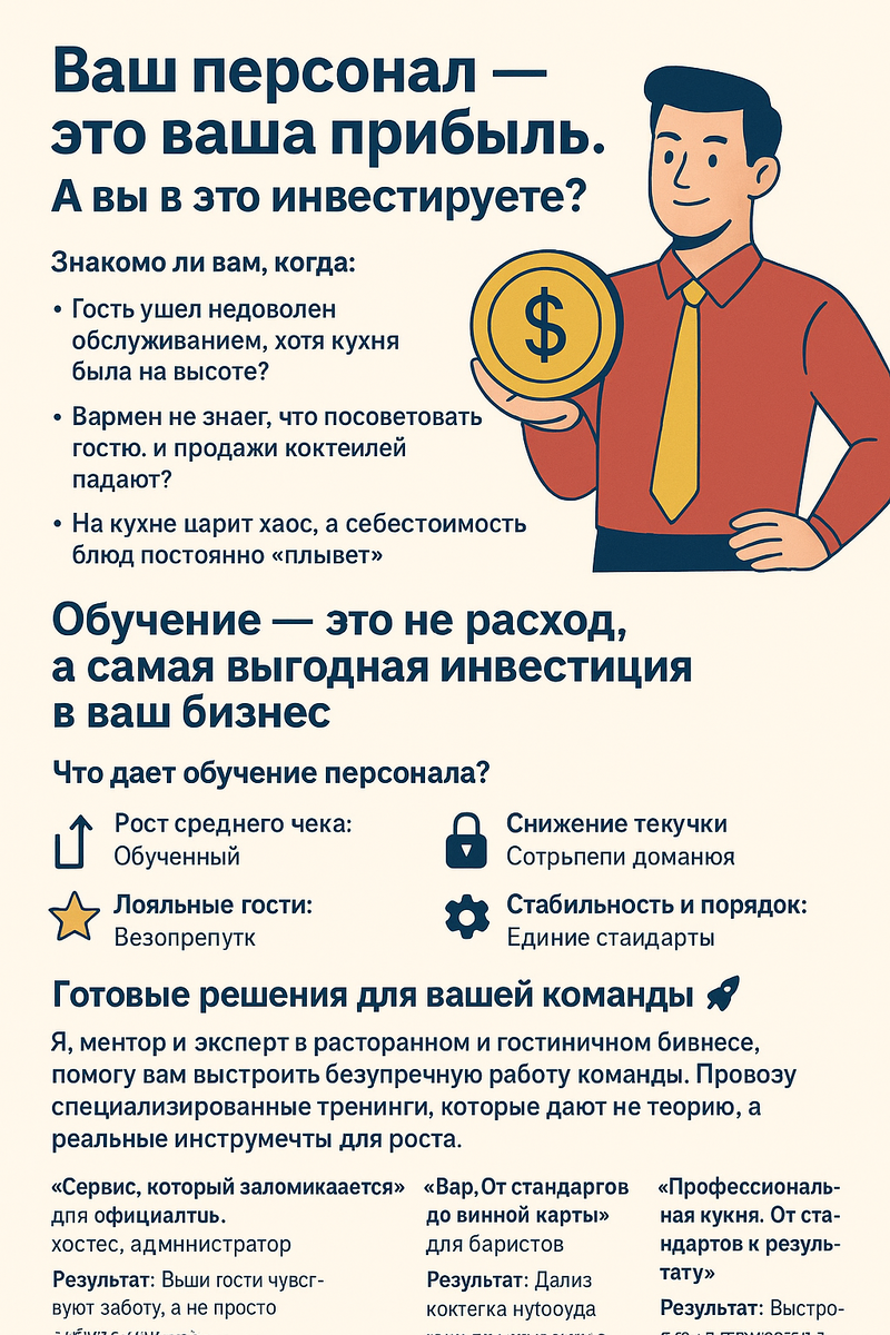 Ваш персонал — это ваша прибыль. А вы в это инвестируете? 💰 Знакомо ли вам, когда: Если да, то проблема не в людях. Проблема — в отсутствии системного обучения. Обучение — это не расход, а самая выгодная инвестиция в ваш бизнес. Это то, что отличает заведение премиум-класса от посредственного и напрямую влияет на выручку. Я, ментор и эксперт в ресторанном и гостиничном бизнесе, помогу вам выстроить безупречную работу команды. Провожу специализированные тренинги, которые дают не теорию, а реальные инструменты для роста. 🎯 Актуальные тренинги для вашего бизнеса: Обученный персонал — это ваш главный козырь в конкурентной борьбе. Не экономьте на том, что приносит деньги. Готовы прокачать свою команду и увидеть реальный рост?