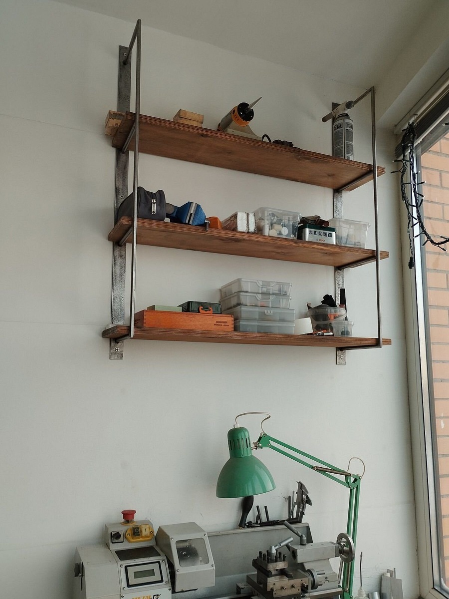На полках прибавилось скарба, а инструментальную панель над станком немного нашпиговал инструментом. Нижнюю полочку, где патрон под сверло и вращающийся центр - приделал буквально сегодня. Прибирался в ящике, и пришла идея. Реализация заняла минут 20. Уголок был уже подходящей длины, разметил насверлил дырок и приладил, все дела. Степень испытанного удовлетворения где то на 4.2 из 5.