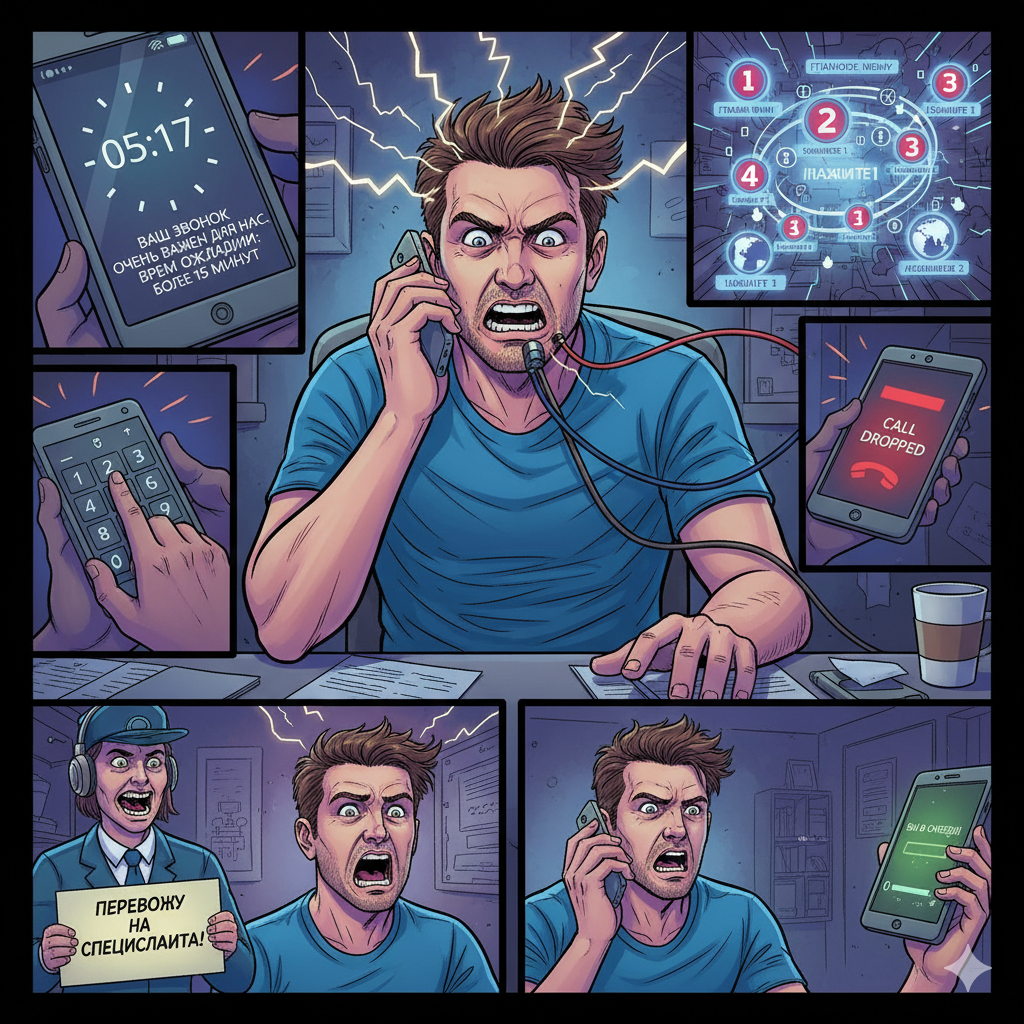 Когда у вас возникла срочная проблема (блокировка счета, отключение интернета, поломка техники), а вы попадаете в бесконечный голосовой лабиринт IVR (интерактивное голосовое меню) службы поддержки.