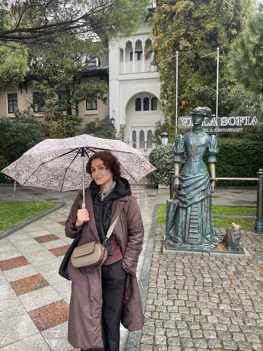 Покажу вам немного осенней Ялты. Гуляли по главному в городе променаду - по набережной. Дома имеют восточный или европейский колорит, вообще город похож на Канны, его почему-то там всю дорогу вспоминала, хотя в самом этом городе никогда не была. Но там многое схоже: море, пальмы, белые гостиницы… за моей спиной -половина памятника от «Дамы с собачкой». Даму как раз видно, собачку тоже, а вот Чехова, или… Баталова я заслоняю зонтом🤷♀️
