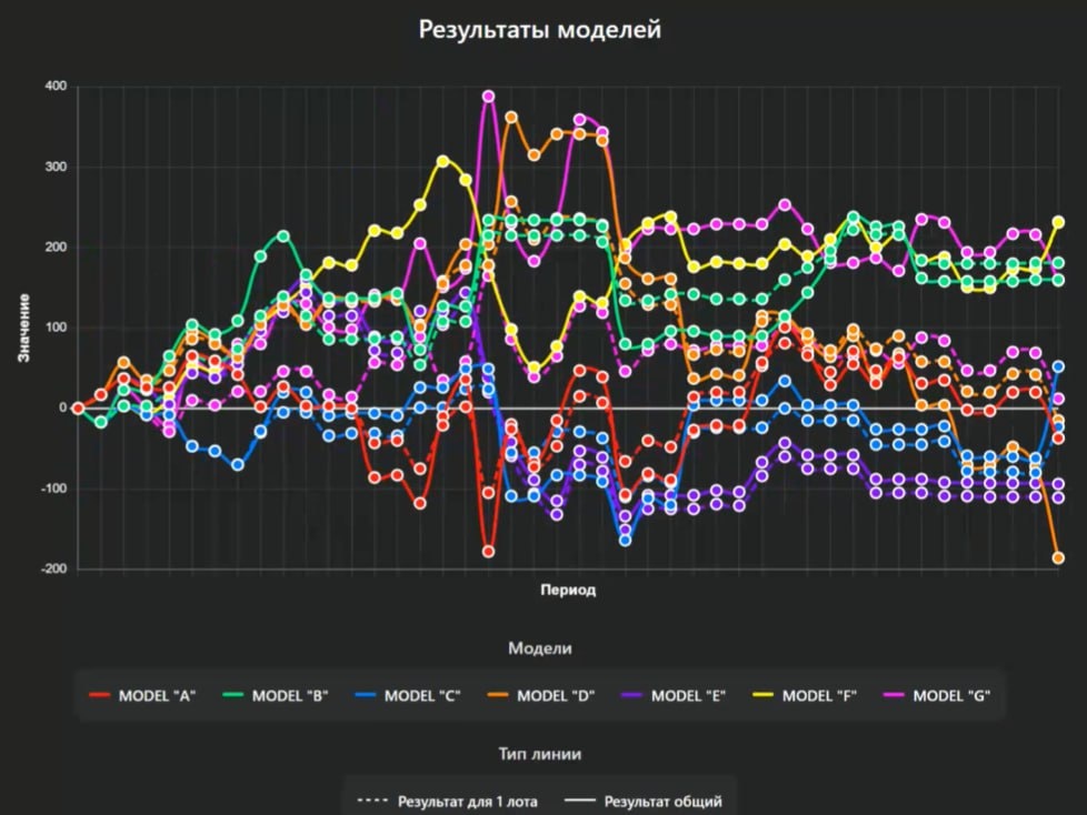 📊 18.11.2025 ┌──────┬────────┬──────┬────┬────────┬────────┐ │МОДЕЛЬ│ПРОГНОЗ │ ВЕР. │ЛОТ │ 1 ЛОТ │ ИТОГ │ ├──────┼────────┼──────┼────┼────────┼────────┤ │ A │ Ниже↓ │ 0.66 │ 1 │ -57 │ -57 │ │ B │ Выше↑ │ 0.58 │ 0 │ 0 │ 0 │ │ C │ Выше↑ │ 0.72 │ 2 │ 57 │ 114 │ │ D │ Ниже↓ │ 0.70 │ 2 │ -57 │ -114 │ │ E │ Ниже↓ │ 0.65 │ 1 │ -57 │ -57 │ │ F │ Выше↑ │ 0.60 │ 1 │ 57 │ 57 │ │ G │ Ниже↓ │ 0.60 │ 1 │ -57 │ -57 │ └──────┴────────┴──────┴────┴────────┴────────┘ Результаты с 15.09.2025 по 18.11.2025 📅 ┌────────────┬───────┬────────┐ │ Модель │ 1 лот │ Общий │ ├────────────┼───────┼────────┤ │ MODEL "A" │ -37 │ -37 │ │ MODEL "B" │ 181 │ 160 │ │ MODEL "C" │ -23 │ 52 │ │ MODEL "D" │ -15 │ -186 │ │ MODEL "E" │ -168 │ -151 │ │ MODEL "F" │ 231 │ 232 │ │ MODEL "G" │ 12 │ 159 │ └────────────┴───────┴────────┘