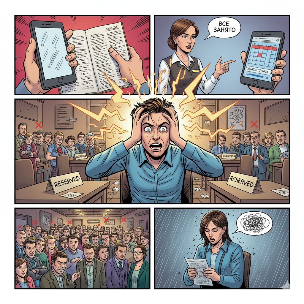 Ваш мозг вынесен ощущением несправедливости, неэффективностью системы бронирования и осознанием того, что голод не тетка, но столик вам не светит.