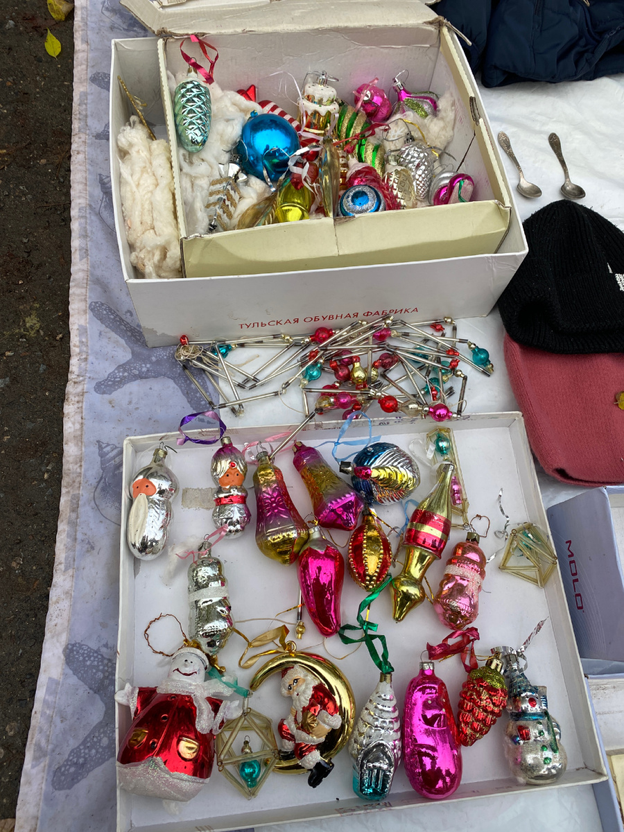 Зачем мы ходим на блошиные рынки? У всех свой интерес. Но случайный человек вряд ли окажется здесь. Каждый ищет свою прелесть, удачное пополнение коллекции или спонтанную приятную покупку. Значки, монеты, посуда - вот то, что я встречаю чаще всего в ассортименте барахолки. Книги, открытки, керосиновые лампы - и все непременно с флером прожитых лет. И точно не скажешь, что радует больше - удовольствие от факта находки или факт обладания тем, что пришло в руки. В день, о котором пойдет речь, на блошке было скромно. Все больше предлагают продавцы елочных игрушек. Советские вперемешку с современными. Какие-то уже знакомы, есть и у меня. Цены от 50 рублей и до…Но толи еще будет, вот-вот их понесут чемоданами😁. В прошлом году так было, во всяком случаем. И оцените надпись коробке - место встречи изменить нельзя) Были пары-гиганты. «Яблоки» Вербилок. Автор росписи А. А. Чекулина. Объем у них, конечно, шикарный - 500 мл. Чтобы пить чай до ключей) Рядом - дулевские агашки, тоже гиганты. Цен
