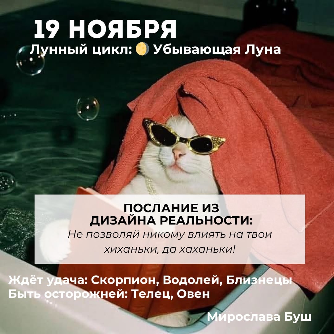 19 ноября РЕКОМЕНДАЦИИ: 💕 Сегодняшний день про простоту и заботу о себе. Уменьшите планы и, вместо огромного списка дел, выберите три самых простых. И позвольте себе хоть на денечек забить на остальное без чувства вины. 💬 Поговорите с кем-то, кто вас понимает. Один короткий, тёплый диалог сегодня будет лучше любого отдыха! 🧴 Совет: сделайте что-то приятное для тела: нанесите крем, сделайте массаж лица, устройте себе лёгкую растяжку дома. Ничего сложного — зато сразу жизнь сразу заиграет совсем другими красками. ✉️ Подписаться на Мирославу