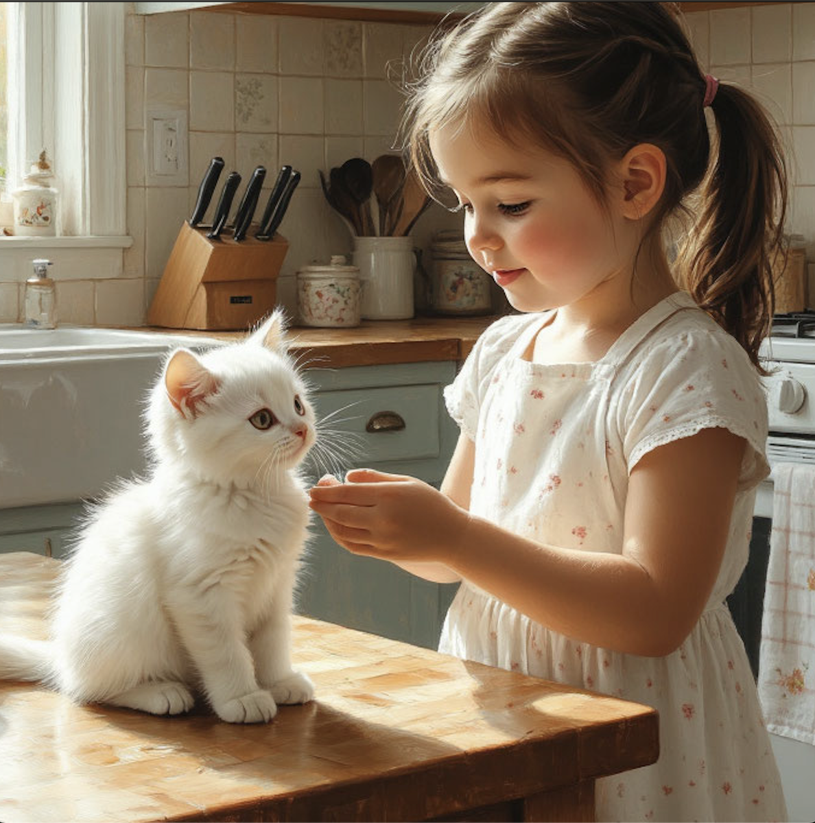 Кошечке стало щекотно от ее прикосновения, и она ловко спрыгнула на пол с кухонного стола на котором сидела.