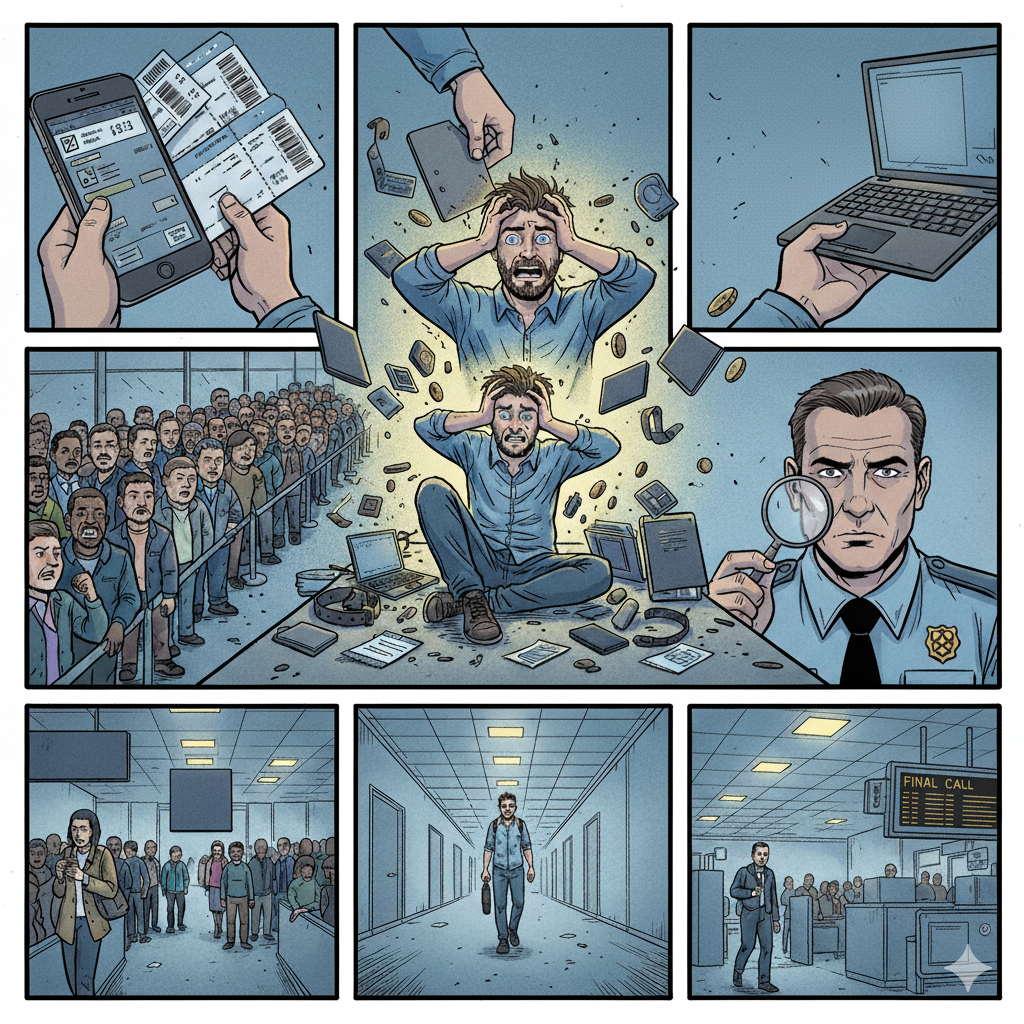 * Тапочки-предатели: Вы прошли досмотр, но забыли зашнуровать ботинки. Вам приходится стоять на одной ноге и натягивать обувь, пока за вами толпится очередь.