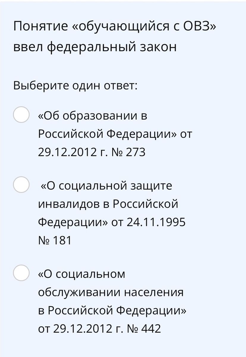 Дети с ограниченными возможностями здоровья - это отдельная категория, с которой работает психолог. И данная психологическая работа регламентируется отдельными нормативно-правовыми документами. Поэтому в экзаменах по «Основам законодательства» встречаются вопросы, касающиеся инклюзивного образования. Например: