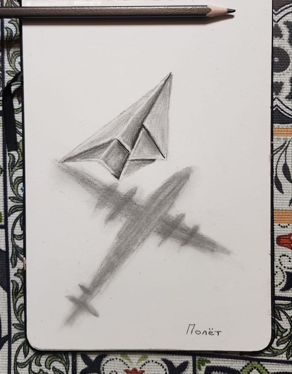 В ответ на пост 🎨 День 18: Полёт. Или история о двух самолётах. Друзья, тема «Полет» оказалась глубже, чем я думала. На моём рисунке — не просто полёт. Это встреча двух реальностей. В небе летит бумажный самолётик — такой, какой мы запускали в детстве, сложив из тетрадного листа. Он — символ наших фантазий, первых мечтаний и смелых планов, которые только готовы взлететь. А под ним, на земле, раскинулась тень от настоящего самолёта. Она — отзвук большой, взрослой жизни, реальных путешествий, огромных скоростей и воплощённых ambitions. Получилась тихая история о том, как наши взрослые «я» несут в себе отпечаток тех самых детей, что когда-то верили, что бумажный кораблик может доплыть до самого горизонта. А что нарисовали вы? Делитесь своими историями о полёте — лиричными, смешными, фантастическими! #день18 #челлендж #темаполёт #бумажныйсамолетик #метафора #творчествобезграниц P.S. Иногда, чтобы взлететь, достаточно листа бумаги и капельки воображения. Не забывайте об этом ✨
