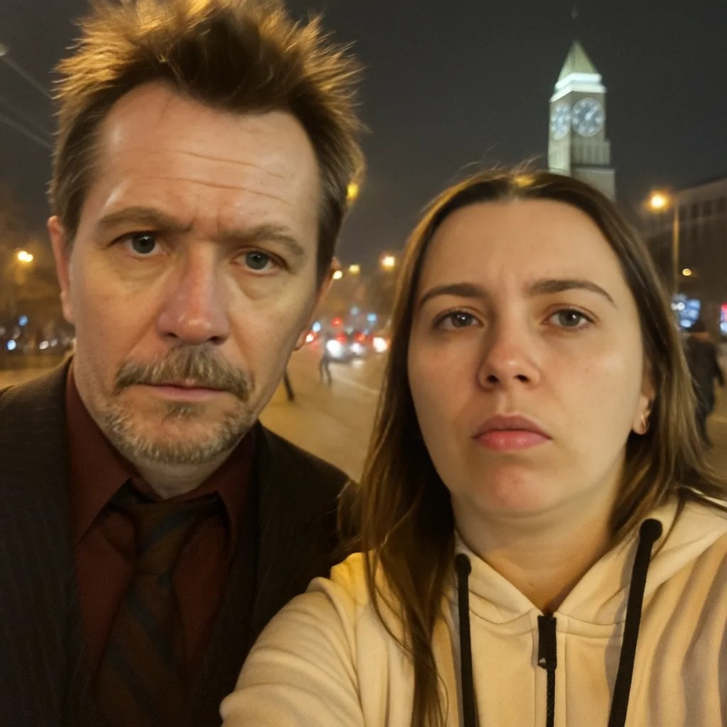 "Главное, братишка, - чтобы шло баблишко" А если вы тоже хотите сделать фотографию с любимым актёром, я подскажу вам промпт для нейросети Sora. Знач, прикрепляете своё фото + фото актера и пишете запрос: Take an extremely ordinary and unremarkable iPhone selfie, with no clear subject or sense of composition—just a quick accidental snapshot. The photo has slight motion blur and uneven lighting from streetlights or indoor lamps, causing mild overexposure in some areas. The angle is awkward and the framing is messy, giving the picture a deliberately mediocre feel, as if it was taken absent mindedly while pulling the phone from a pocket. The main characters are uploaded