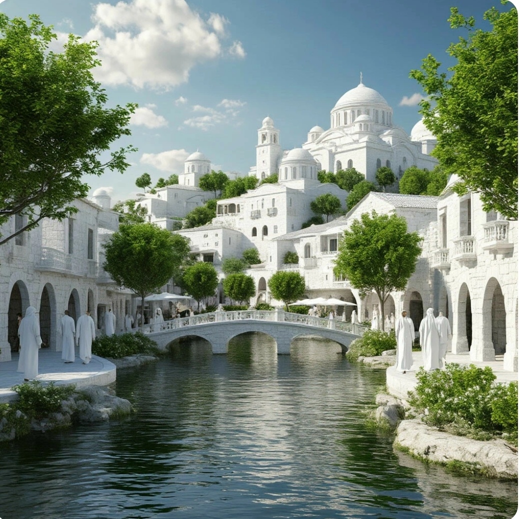 Всё началось на рассвете. Я вышла на крыльцо, потянулась, вдохнула свежий воздух — и замерла. Напротив, за речкой, где всегда были лишь луга да заросший кустарником берег, теперь раскинулся… город. Не наш город — совсем другой. Дома странные: будто сложены из полупрозрачных блоков, переливаются на солнце, словно сделаны из опала. Улицы ровные, прямые, между ними — зелёные полосы, похожие на каналы. По дорожкам ходят люди в белых одеждах, неспешно, будто плывут. Кто‑то несёт что‑то похожее на свитки, кто‑то разговаривает, жестикулируя плавно, как в танце. Я крикнула матери. Она выглянула, ахнула, побежала звать соседей. Через полчаса у реки толпились почти все деревенские — стояли, молчали, смотрели, не веря глазам. — Это мираж, — прошептал дед Игнат, крестясь. — Не может быть. Но это было. Мы наблюдали, как в том мире люди заходят в дома, садятся у фонтанов, дети бегают между деревьями с широкими листьями. Всё так чётко, будто смотришь кино, только без звука. Кто‑то пытался фотографи