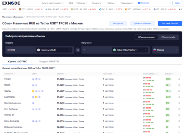 Зайдите на мониторинг Exnode, где собраны проверенные обменники USDT в Москве за наличные рубли. Сравните актуальные курсы, отзывы пользователей и условия работы каждого сервиса. Это позволит понять, где купить USDT за рубли максимально выгодно и безопасно.