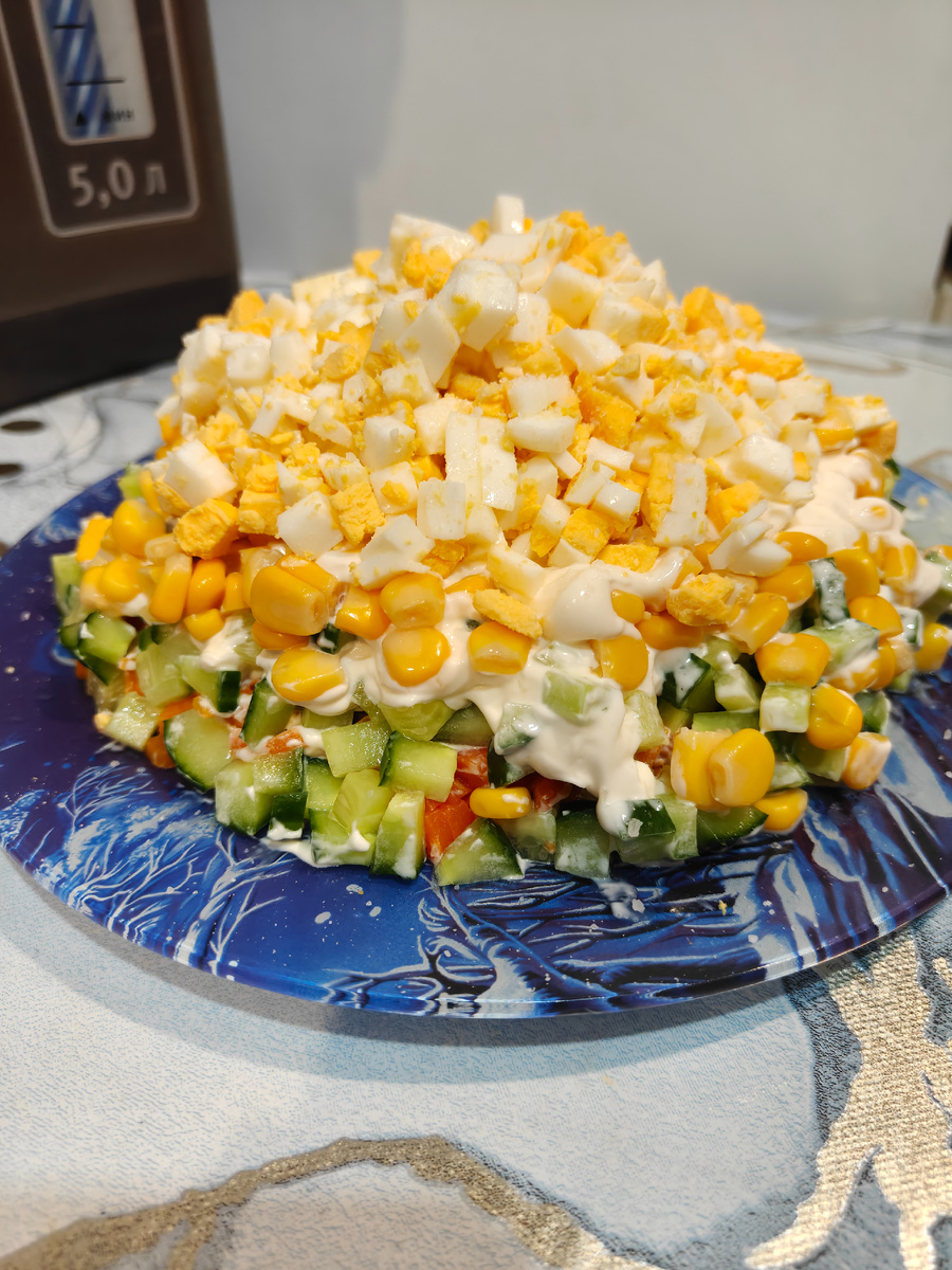 Сегодня готовим вкусный салат из тех ингредиентов, которые есть у всех на кухне. Салат получается вкусным, сочным и для всей семьи, и для любого праздника. Ингредиенты: Яйца – 5 шт. Морковь – 1-2 шт. Лук – 1 шт. Консервированная кукуруза – 1 банка Огурец (свежий) – 2 шт. Консерва (сардина) – 1 банка Майонез – по вкусу. Соль – по желанию. Ну, что.... Готовим ... Для начала отвариваем яйца и морковь. Морковь предварительно нужно хорошо помыть. Если большая, то режем пополам, чтобы сварилась хорошо. Даём остыть и затем нарезаем на небольшие кубики. Затем шинкуем лук и огурец. Открываем кукурузу и сливаем жидкость. Давайте откроем банку с консервой, выкладываем ее на тарелку и измельчаем вилкой. Подготовка завершена. Теперь давайте собирать салат. Салат у нас собирается слоями. Для этого берём большую круглую тарелку, но можно использовать и форму, если мы хотим более ровный слоёный салат. Первым слоем выкладываем измельчённую консервы, как я и писала в ингредиентах у меня это са