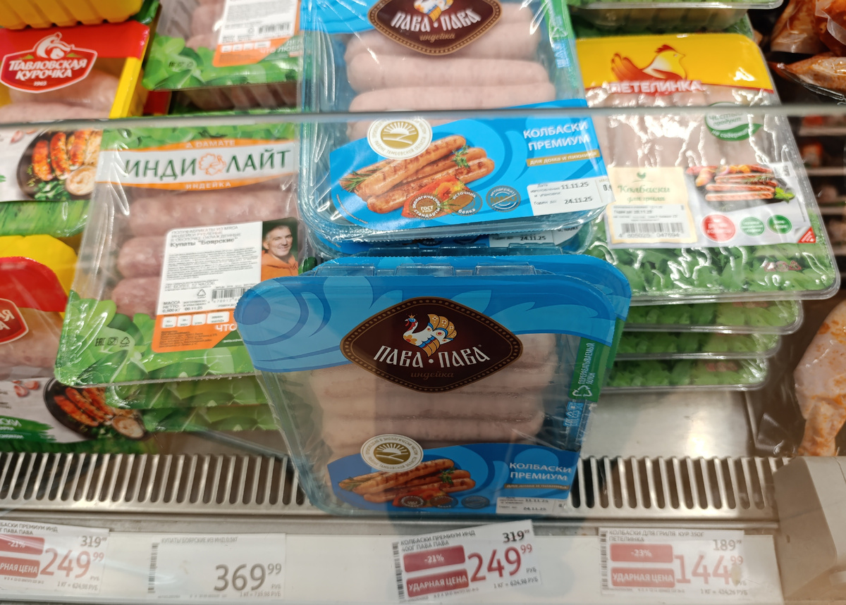 Эти самые колбаски в холодильной витрине "Ашана". Правее голубой упаковки колбасок из индейки "Пава-пава". Ценник внизу справа, 144 руб вместо 189 руб! Я думал, что сэкономил...
