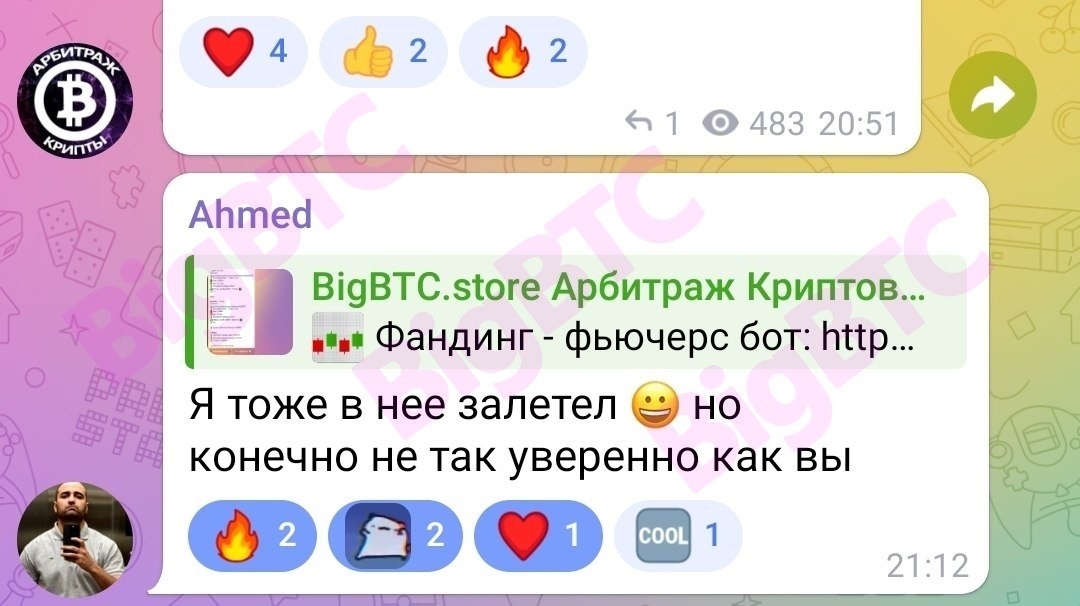 BigBTC - Арбитраж крипты без карт 🤑Наши телеграмм-боты - сканеры в реальном времени ищут связки для арбитража криптовалют без использования банковских карт (как в классическом p2p арбитраже) ✅Все наши ресурсы: https://bigbtc.store/link/dzen Binance - BestChange бот: https://t.me/cryptocurrency_arbitrage_bot?start=dzen ByBit - BestChange бот: https://t.me/arbitrage_bybit_bot?start=dzen Mexc - BestChange бот: https://t.me/arbitrage_mexc_bot?start=dzen Межбиржевой бот: https://t.me/BigBTC_arbitrage_bot?start=dzen Фандинг - фьючерс бот: https://t.me/BigBTC_funding_bot?start=dzen Обучающий бот (бесплатный): https://t.me/BigBTC_learning_bot Партнёрская программа: https://t.me/BigBTC_ref_bot 🌐Сайт: https://BigBTC.store 💬Чат: https://t.me/BigBTCchat Нужно нажать кнопку "Я не бот" при первом входе 📰Канал: https://t.me/BigBTCchannel Новости, отзывы, гайды, итоги работы 👨‍💻Поддержка 1: https://t.me/BigBTCsupport4 👨‍💻Поддержка 2: https://t.me/BigBTCsupport3 🎁Ссылки регистрации на биржах,