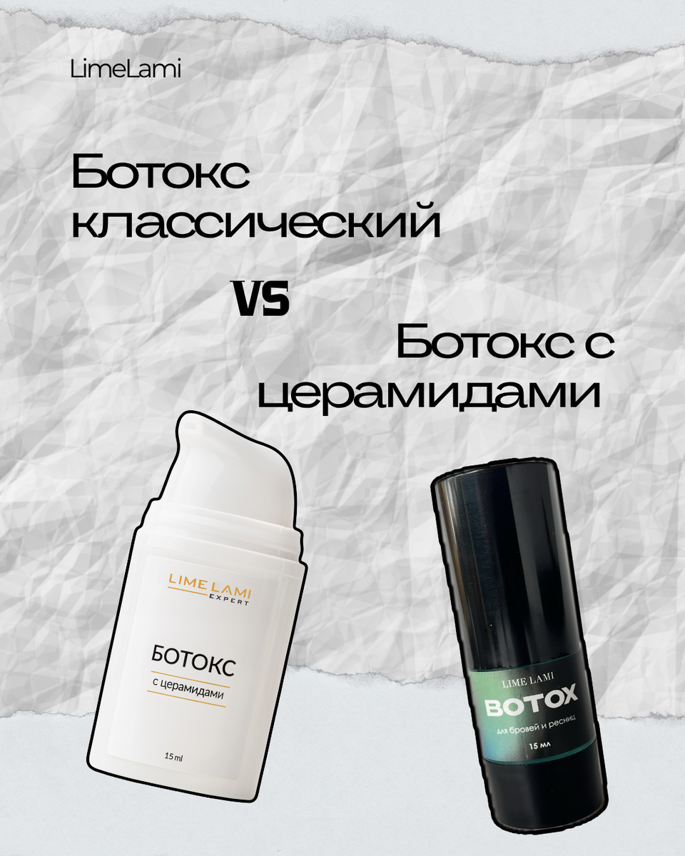 Оба средства отлично увлажняют, питают и делают волоски гладкими после процедур. Но разница всё-таки есть 👇🏻 Ботокс с церамидами — вариант для восстановления. Церамиды заполняют повреждения, удерживают влагу и укрепляют волосок. Подходит тем, у кого брови или ресницы тонкие, сухие, часто ламинируются, окрашиваются или пережжены процедурами. Классический ботокс LimeLami - универсальный уход. Мягко увлажняет, делает волоски гладкими и ухоженными, подходит для нормальных или слегка сухих бровей и ресниц, а также как базовый продукт мастера на каждый день. Если коротко: Лучший вариант для мастера - иметь оба
