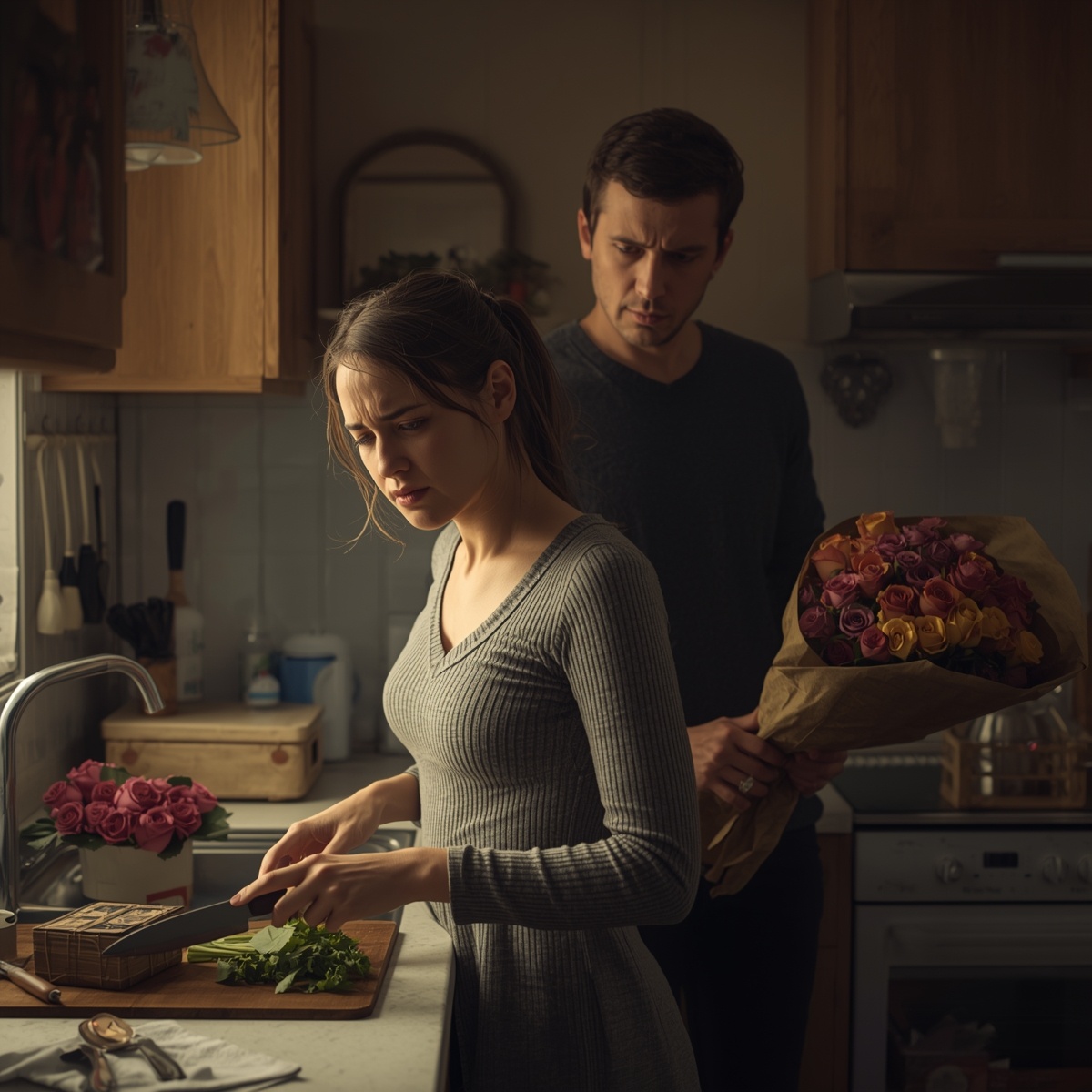 Денис поставил букет в раковину, коробку - на столешницу. Подошёл к жене, попытался обнять сзади. Лена отстранилась.