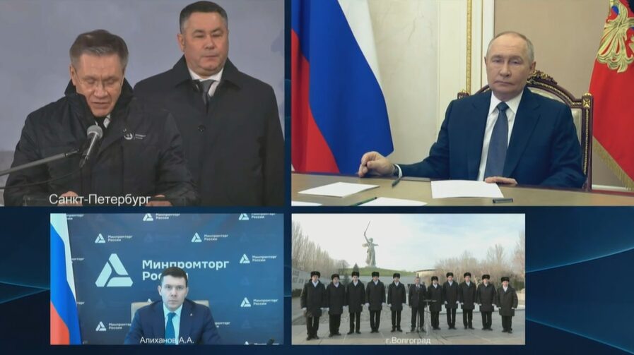 Президент России Владимир Путин в режиме видеоконференции во вторник принял участие в церемонии закладки шестого серийного универсального атомного ледокола «Сталинград» в Санкт-Петербурге. На кадрах генеральный директор «Росатома» Алексей Лихачёв, губернатор Волгоградской области Андрей Бочаров и ветеран Великой Отечественной войны Павел Винокуров выступают на мероприятии. Лихачёв отметил символичность названия нового судна. «Это знак глубокого уважения к памяти наших героических предшественников. И в год 80-летия Великой Победы, и в год 80-летия атомной промышленности мы чувствуем это особенно остро, особенно сильно. И намерены, конечно, твердо продолжать их дело», — подчеркнул глава госкорпорации. Генеральный директор также сообщил, что в настоящее время в Арктике работают восемь атомных ледоколов. «По вашему поручению строится еще четыре. Это олицетворение нашего полного технологического суверенитета в создании и эксплуатации передовых реакторных установок для флота, имеющих ключево