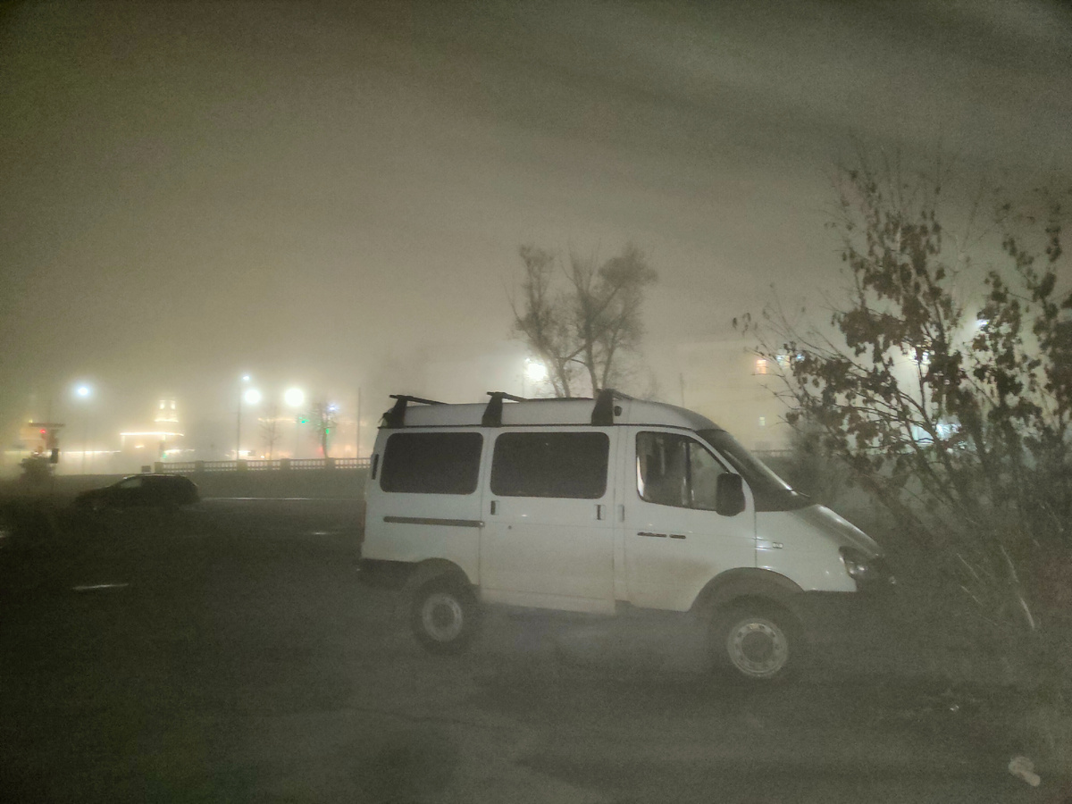 Место парковки возле парка Тысячелетия тихое и спокойное. В этом возникла наша сложность. Оказалось локация облюбована романтическими парочками в машинах. Причём они на совершенно пустой стоянке старались прижаться как можно ближе к бусу. Прячась за его широкой спиной. Нас это стало забавить. Такое развлечение перед сном. Стоило любовникам понять, что они не одни, включалась экстренная эвакуация. Кому-то хватало моей моси в открытом окне буса. Кому, включенных фар или габаритных огней. Набравшись наглости я стал просто выходить из машины в шортах и майке вальяжно почёсывая живот. И наблюдая как чёрная и тонированная Камри срывается с места. Всё это было весело до поры. Но ночевать на этом месте при такой популярности расхотелось. На улице было классно. Город затих и погрузился в туман.