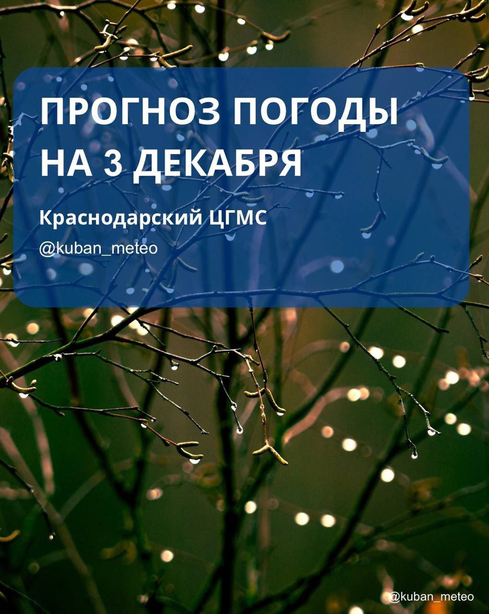 ☁️⛅⛈️ 🌧️ 3 декабря 🗓️ По Краснодарскому краю: Облачно с прояснениями. • Ночью и утром местами небольшой дождь • В горах: осадки в виде дождя и мокрого снега • Днём: преимущественно без осадков • Местами туман 💨 Ветер восточной четверти 4-9 м/с 🌡️ Температура воздуха: • Ночью: 1…6° • Днём: 5…10° • В горах: • Ночью: -1…-6° • Днём: -2…+3° 🌊 На Черноморском побережье: Переменная облачность. • Ночью и утром местами небольшой дождь • Днём: преимущественно без осадков 💨 Ветер восточный, северо-восточный 6-11 м/с 🌡️ Температура воздуха: • Ночью: 5…10° • Днём: 10…15° 🏙️ По г. Краснодару: Облачно с прояснениями. Преимущественно без осадков. • Ночью, утром и в первой половине дня: туман 💨 Ветер восточный 4-9 м/с 🌡️ Температура воздуха: • Ночью: 4…6° • Днём: 8…10° С заботой, Краснодарский ЦГМС @kuban_meteo 💙