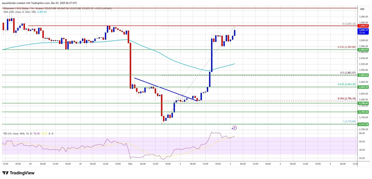🎯 Ethereum Наращивает Обороты, Приближаясь к Ключевому Уровню Сопротивления 📈 Цена Ethereum выросла выше $2,920, демонстрируя сильный бычий импульс. Сейчас актив пытается пробить сопротивление на уровне $3,050. Успешное преодоление этого уровня может привести к значительному ускорению роста. Аналитики отмечают, что ETH торгуется выше $2,950 и 100-часовой простой скользящей средней, что подтверждает восходящий тренд. Преодоление краткосрочной медвежьей линии тренда на уровне $2,825 также стало позитивным сигналом для быков. 📊 Ключевые моменты: - Текущая цена ETH: $3005.29 (+7.45% за 24 часа) 🔥 - Сопротивление: $3,050, далее $3,080 и $3,120. Прорыв выше $3,200 может открыть путь к $3,350-$3,380. - Поддержка: $2,970, $2,880 (50% Фибо), $2,840. - Технические индикаторы: Часовой MACD и RSI показывают бычий импульс.
