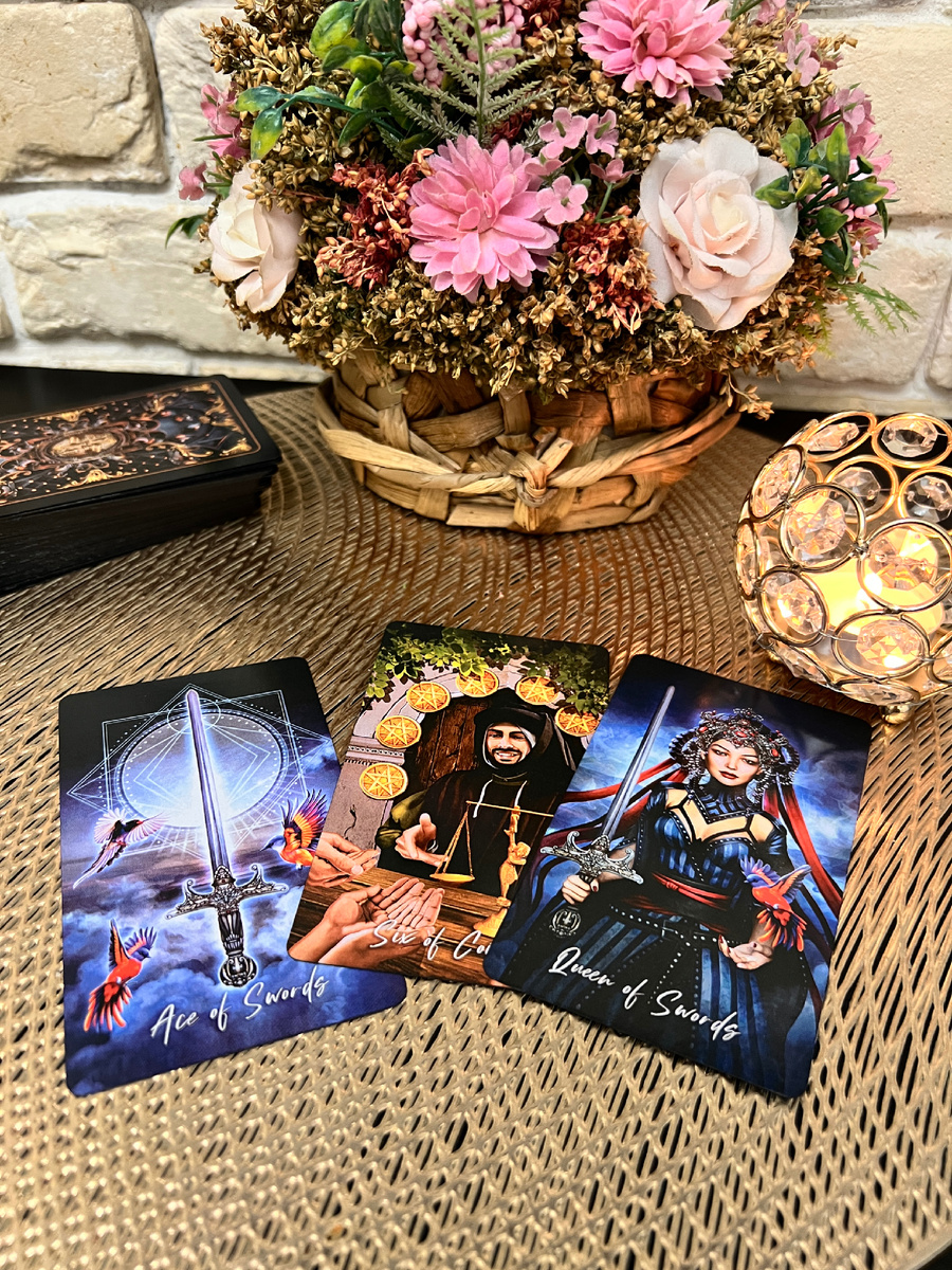 Между двумя людьми всегда существует незримое пространство. В нем живут мысли, которые не стали словами, чувства, которым не дали имени, и образы, которые рисует один о другом. Каким я вижусь ему в этом тайном пространстве? Легкой тенью или ярким пятном? Спокойной гаванью или бушующим морем? Чтобы заглянуть туда, я использовала язык символов — древний и мудрый язык Таро. Карты, как верные проводники, показали мне интересную картину. Эти три карты вместе создают невероятно четкий и многогранный портрет. Это не про случайные мысли, а про системный взгляд. Давайте разбирать по порядку. 1. Туз Мечей: Он видит в вас силу и ясность. Первая карта и это первое, что приходит в голову человеку, когда он думает о вас. Туз Мечей, карта интеллектуального прорыва, острой правды, силы ума и решимости. Это клинок, рассекающий илзии. Что это значит для вас? 💫 Он воспринимает вас как человека умного, логичного, способного на ясные и четкие решения. Возможно, вы когда-то поразили его своей прон