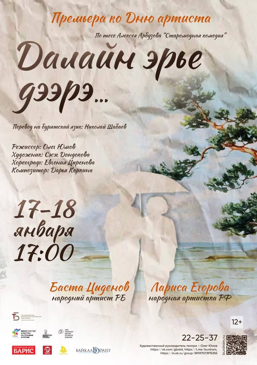 Буряад театр приглашает на премьеру нового спектакля «Далайн эрье дээрэ» 17 и 18 января 2026 года, специально ко Дню актера, мы представим вам постановку по пьесе Алексея Арбузова «Старомодная комедия». Это история о любви, которая не знает границ возраста и времени. Музыка и танцы в исполнении молодых артистов театра станут отражением чувств главных героев, показывая, как любовь может вспыхнуть в любом возрасте. Билеты уже в продаже на сайте https://vk.cc/cGXDK4 Возрастное ограничение: 12+