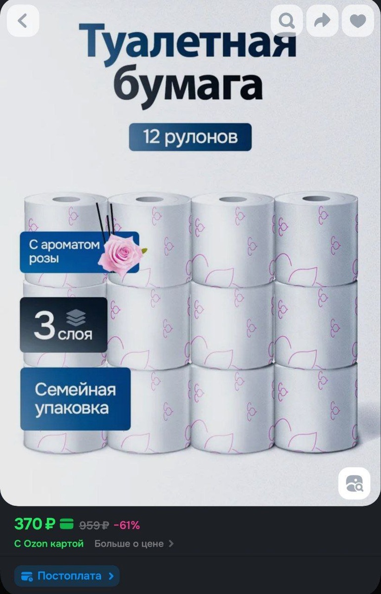 Туалетная Бумага ROSE 12 рулонов 3 слоя с ароматом Розы за 370₽ https://ozon.ru/t/BxPF33c