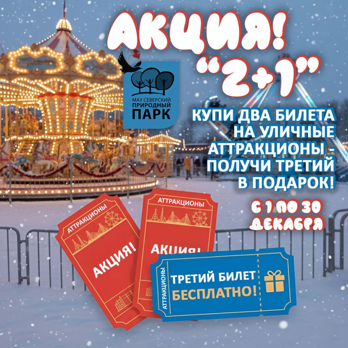 🎁 Акция "2+1" на уличные аттракционы! С 1 декабря по 30 декабря в Северском природном парке действует специальное предложение: При покупке двух билетов на уличные аттракционы – получите третий билет в подарок!🎉 Отличный повод провести выходные или каникулы на свежем воздухе с семьей и друзьями! 🎡 Вас ждут любимые развлечения на свежем воздухе: 🔸 На Детской площадке аттракционов: - Юнга - Грибок - Светофор - Малютка - Праздничная карусель 🔹 На Взрослой площадке аттракционов: - Кросс тюббинг - Лодочки - Жемчужина (работает при подходящих погодных условиях) Обратите внимание, что в акции НЕ участвуют: Комната смеха, Паровозик "Веселая радуга", Зал игровых аттракционов, Стрелковый тир. Не упустите возможность получить больше развлечений за меньшую цену! Аттракционы ждут вас со среды по воскресенье с 9:00 до 18:00, понедельник - вторник: выходные дни! #СеверскАфиша #Северск #ПаркСеверск #Афиша #Акция #Скидки #Аттракционы