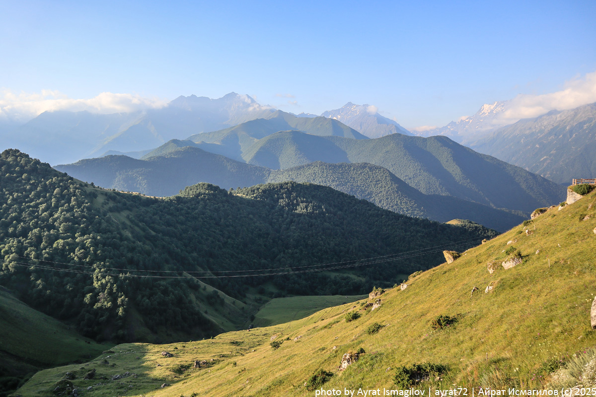 На перевал я поднялся из Джейрахского ущелья, где ранним утром изучал башенный комплекс Эрзи. Еду строго на восток, навстречу солнцу, снимки на остановках делаю в обратном направлении, т.е. назад по ходу движения.