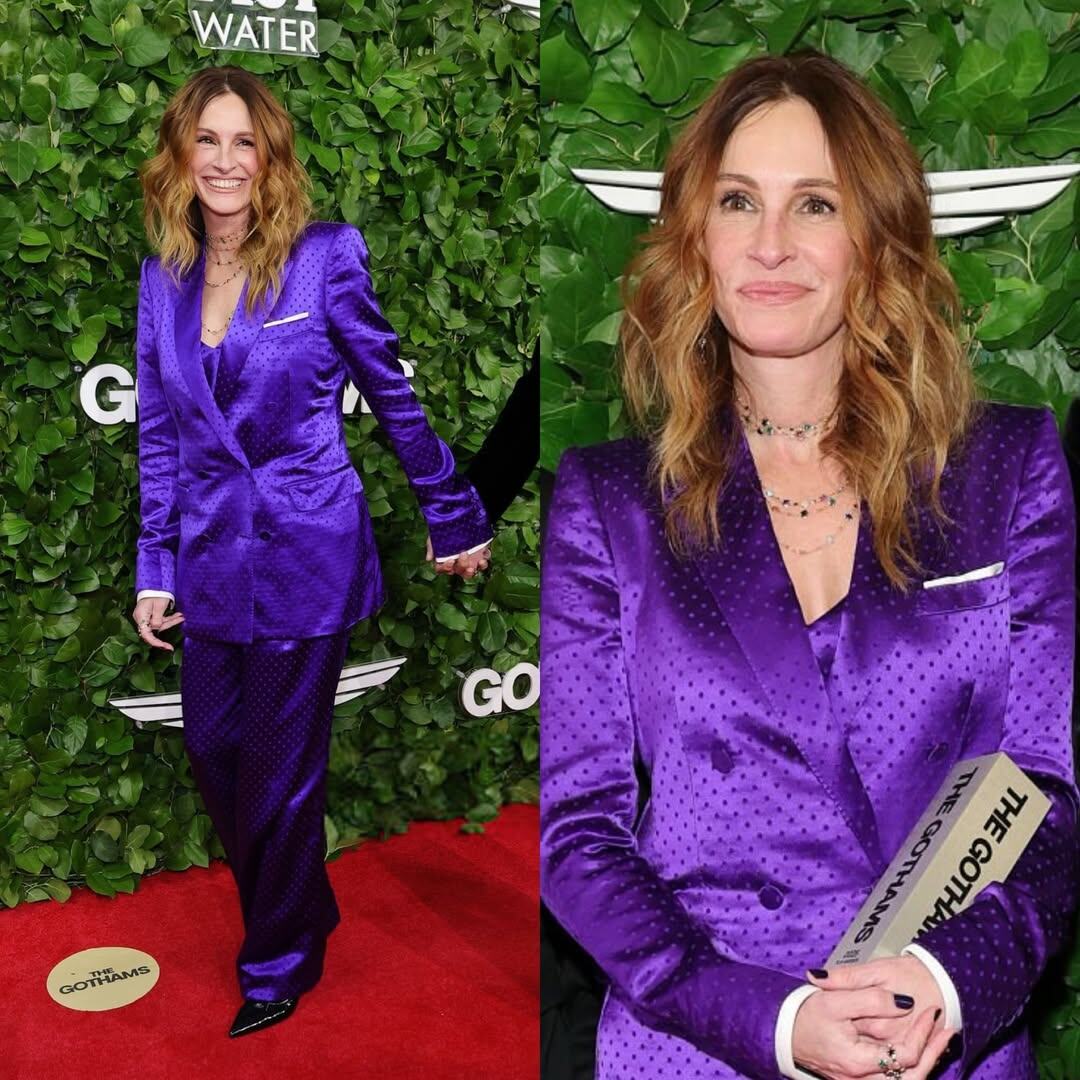 На красной дорожке Gotham Film Awards 2025 в Нью-Йорке, где обычно царят вечерние платья, блеск камней и предсказуемая торжественность, Джулия Робертс вновь выбрала свой стиль. Вместо платья — фиолетовый шёлковый костюм в горох. И именно этот выход стал главным визуальным событием вечера. Двубортный жакет с выстроенной линией плеч, широкие брюки, манжеты с эффектом выглядывающей белой мужской сорочки. Под жакетом — не строгая офисная блуза, а шелковый топ с мягким вырезом. Острые чёрные лодочки, многослойное колье из цветных камней, прямой пробор и спокойные волны. Костюм создан Хайдер Акерман для Tom Ford и относится к весенней коллекции 2026 года. На подиуме его показывали с закрытой шёлковой блузой с воротником. Робертс показала образ по-своему, убрав формальность и добавив чувственности, не разрушив при этом архитектуру силуэта. В этот вечер актриса вместе с режиссёром Лука Гуаданьино получила почётную награду Visionary Tribute за фильм «После охоты». Её партнёрами по картине
