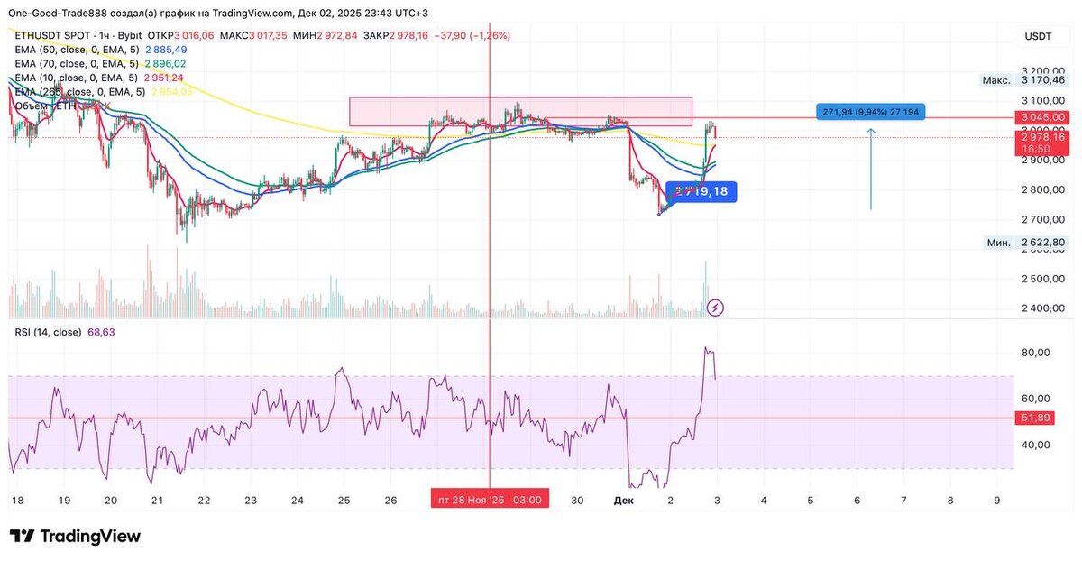 #ETH 🔸 Локальный минимум был поставлен на отметке 2719,18$ 🔸 От этой зоны оформили сильную реакцию покупателя. 🔸 Теперь необходимо дождаться дальнейшего движения цены. 🔸 Сегодня точного прогноза выдать не получится. Есть только условия, выполнение которых покажет дальнейшее направление цены. 🔸 Если текущий локальный рост истинный ( а не вынос коротких позиций продавцов) покупателям необходимо удержать поддержку на 2850$ - 2900$. 🔸 В таком случае можно будет расчитывать на пробой 3000$ с первой целью на рост 3375$. 🔸 Далее по реакции цены на эту зону
