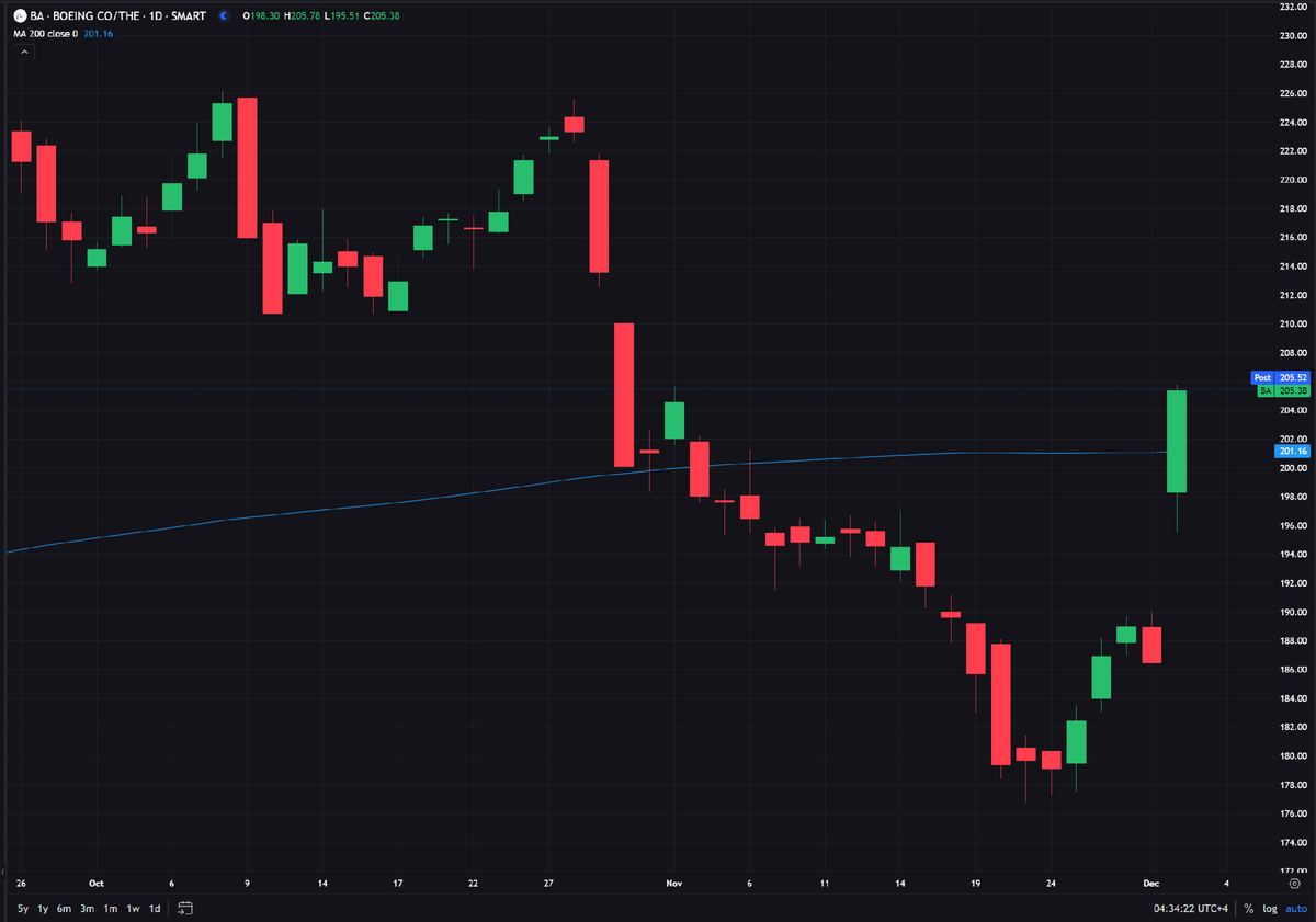 Акции Boeing вчера были особенно сильны. Компания ожидает увеличения поставок самолётов 737 и 787 в следующем году, и акции выросли более чем на 10%. Примечательно, что $BA входит в индекс Dow Jones, но если бы Dow Jones взвешивался по рыночной капитализации, то Boeing практически не оказал бы влияния.