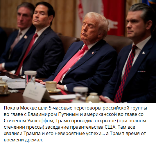 BBC News: "Встреча Путина с Уиткоффом и Кушнером продлилась около пяти часов и закончилась в половине первого ночи по Москве. Она началась около 19:30 по московскому времени - почти на три часа позже, чем анонсировалось (так у президента было много других дел, он предупреждал).