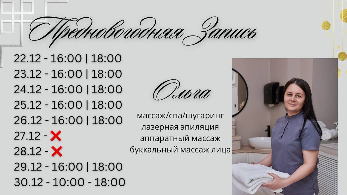 💥 Места тают! Успей записаться к Новому Году! 📅 22–30 декабря — свободные окна ко всем мастерам 💅 Маникюр | 🦶 Педикюр | ✨ Лазерная эпиляция 🎁 И не забывайте, что в декабре каждый гость получает подарок от нашего центра! ⚡ Места разбирают быстро — не откладывай, записывайся прямо сейчас! 📲 Записаться очень просто: — Написать нам в сообщения — Позвонить 8-950-966-16-77 — Онлайн запись по ссылке: https://www.salon1c.ru/widget-org/812443279 📍 г. Абакан, ул. Некрасова, 37 ✨ Красота, уют и праздничное настроение ждут тебя — успей забронировать своё время!