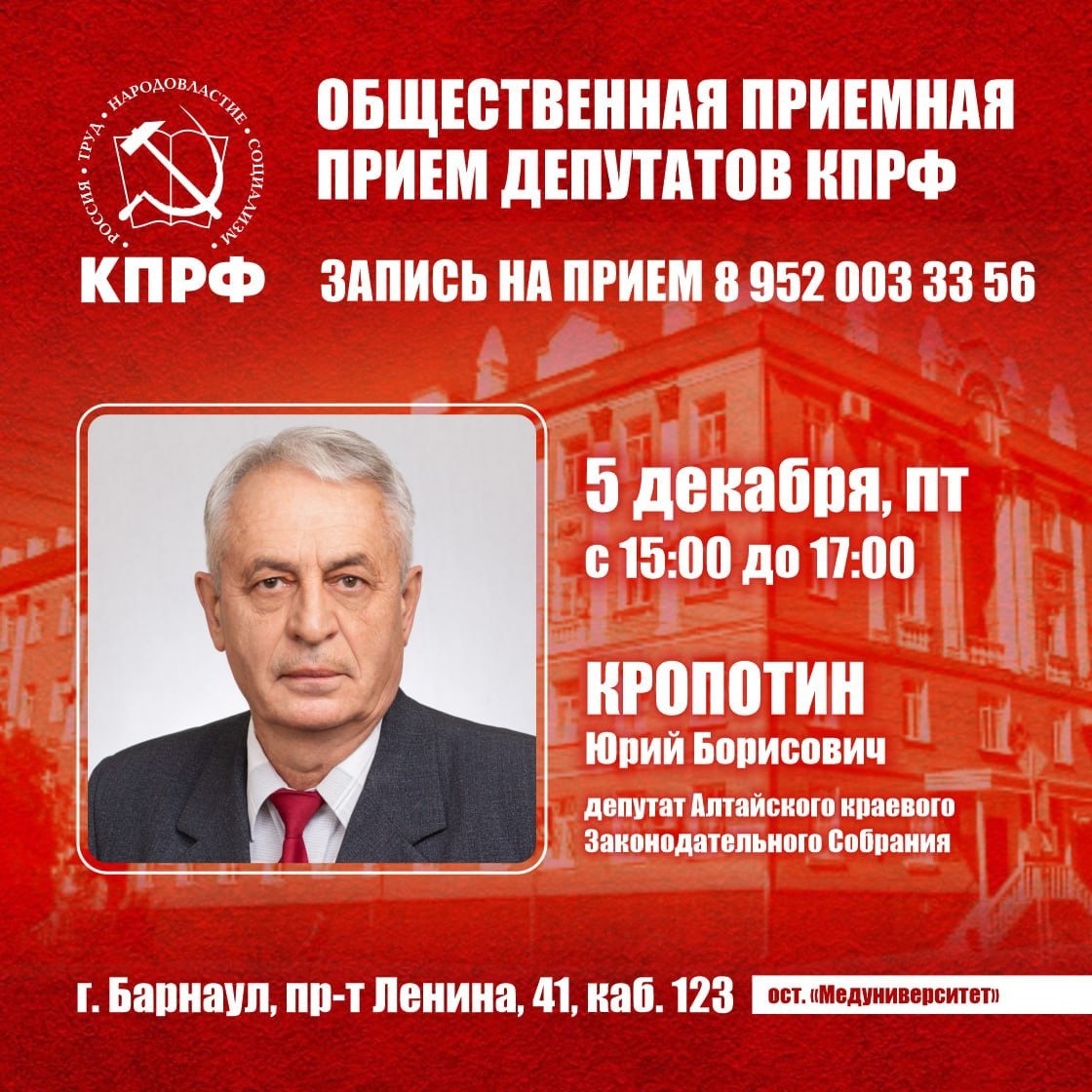 Приемные дни депутатов Алтайского краевого Законодательного Собрания по адресу: г. Барнаул, пр. Ленина, 41, каб. 123. 📌 5 декабря, пт, 15:00 – 17:00, КРОПОТИН Ю.Б., депутат АКЗС ☎️ Предварительная запись по тел. 8-952-003-33-56