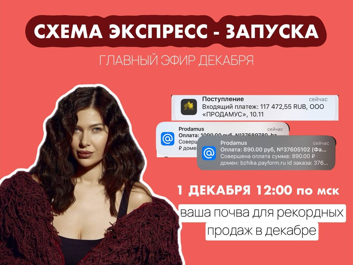Сегодня в 12:00 — главный эфир декабря Эфир, который задаст вам движение на весь декабрь и поможет подготовить почву для рекордных продаж. Если вы планируете продавать в декабре, запускаться, усиливать блог, набирать аудиторию или хотя бы не потерять темп — сегодня нужно быть. Что будет на эфире: Я разложу для вас схему экспресс-запуска, которую сама использую в своих продажах и в крупных запусках. Это та схема, по которой мы с экспертами зарабатывали по 45 – 300 тысяч за 7 дней, даже на маленьких чеках. Что еще: ✔️какие новогодние смыслы усиливают конверсию и почему ✔️как собрать предложение так, чтобы его покупали сразу ✔️почему декабрь может стать вашим самым денежным месяцем ✔️этапы подготовки и проведения экспресс запуска ✔️Источники трафика, от куда брать аудиторию? И как ее прогреть всего за 7-14 дней и сделать продажи? ✔️как вы сможете СДЕЛАТЬ ЭКСПРЕСС-ЗАПУСК СО МНОЙ Подарки После сегодняшнего эфира у вас появилась чёткая система, по которой можно запустить продажи в дек