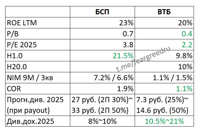 #отчетность #портфель $BSPB $VTBR Отчетности ВТБ и БСПБ за 9 мес. - кто лучше? Два таких разных банка в моем портфеле. БСПБ был в портфеле довольно давно. ВТБ появился под "дивидендный сюрприз", пополнился покупкой по преимущественному праву, да так и обосновался в портфеле. Посмотрим на отчетности за 9 мес. и оценим перспективы обоих банков. 1️⃣ БСПБ начал начислять большие резервы, начиная с июня, что негативно сказалось на прибыли. Гайденс по прибыли на 2025 - 40 млрд, на 2026 - 35+ млрд. (против 51 млрд. в 2024 году, т.е. банк консервативно гайдит снижение прибыли). Важно, что БСПБ сфокусирован на корпоративном сегменте, и судя по резервам, дела у предприятий идут не важно. Кроме того, закономерно со снижением ключевой ставки, снижается и чистая % маржа (ЧПМ). Из плюсов - действующая программа байбек (ее хватит примерно на 3.5% акций, после приобретения акции обычно гасятся) и большой запас по достаточности капитала, который можно будет реализовать при оживлении экономики. Вп