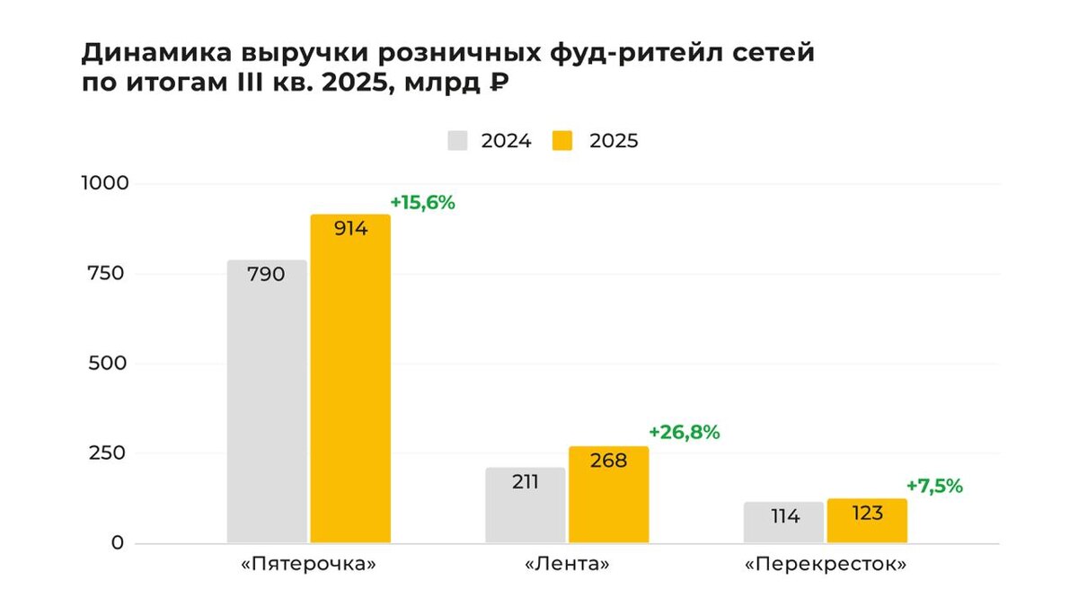 Розничный фуд-ритейл отчитался за III кв. 2025 г. 🔸Продуктовый ритейл «Лента» отчитался о росте выручки на 26,8% (здесь и далее — по сравнению с III кв. 2024 г.). Увеличение показателя обусловлено расширением сети и внутренней оптимизацией. Арендатор представлен в фондах А-5 и А-19. 🔸Сеть магазинов «Пятерочка» сообщила о росте показателей выручки на 15,6%. Рост обусловлен программой реновации, изменением ассортиментной политики. Арендатор представлен в фонде А-1. 🔸Сеть супермаркетов «Перекресток» зафиксировала рост выручки на 7,5%. Основная причина — инфляция. Арендатор представлен в фондах А-10, А-11 и А-18. #арендаторы #новости